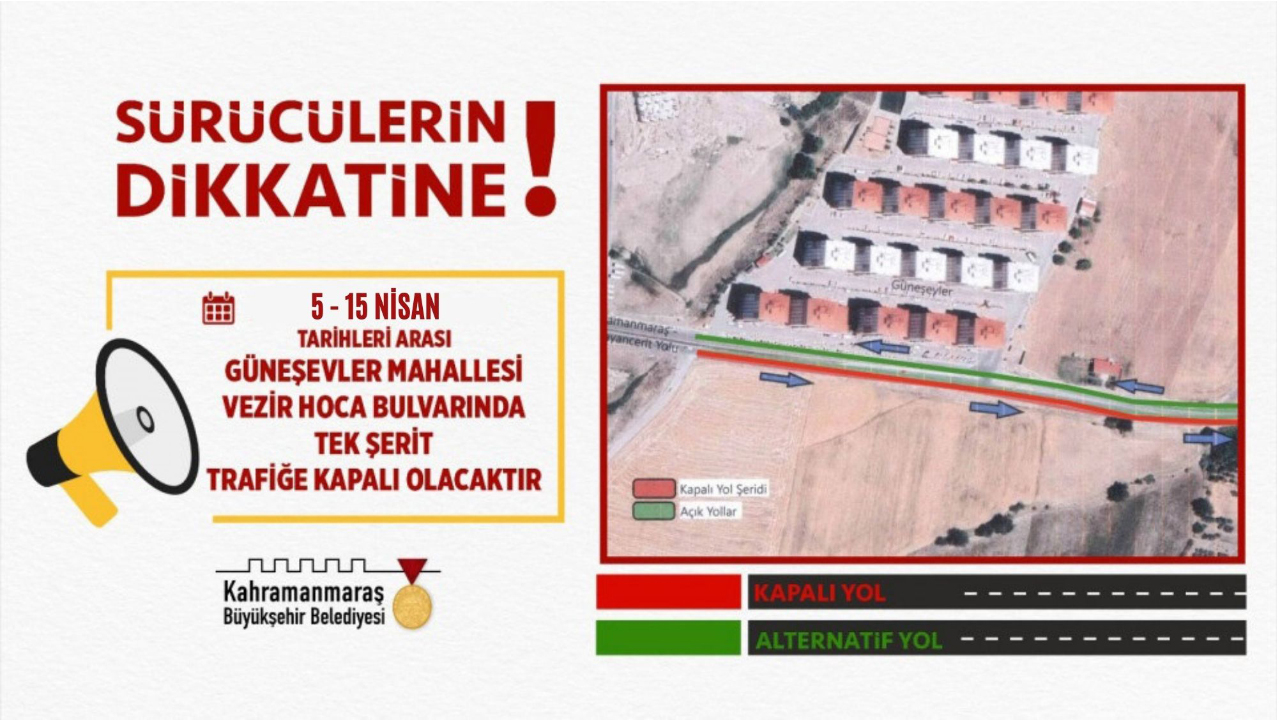 Kahramanmaraş Büyükşehir Belediyesi KASKİ Genel Müdürlüğü ekipleri tarafından, Dulkadiroğlu Güneşevler Mahallesi’nde kanalizasyon hattı çalışmaları gerçekleştirilecek. Bu kapsamda, alınan UKOME kararları doğrultusunda Vezir Hoca Bulvarı’nın tek şeridi 5 – 15 Nisan tarihleri arasında trafiğe kapalı olacak. Ulaşım Hizmetleri Dairesi Başkanlığı’nda karara ilişkin yapılan açıklamada, “Büyükşehir Belediyesi ekiplerimiz tarafından Vezir Hoca Bulvarı’nda altyapı çalışmaları gerçekleştirilecek. Bu kapsamda, Vezir Hoca Bulvarı’nın tek şeridi 5 – 15 Nisan tarihleri arasında ulaşıma kapatılmıştır. Vatandaşlarımız trafikte dikkatli olmaları ve alternatif güzergâhları tercih etmeleri önem arz etmektedir” ifadelerine yer verildi.