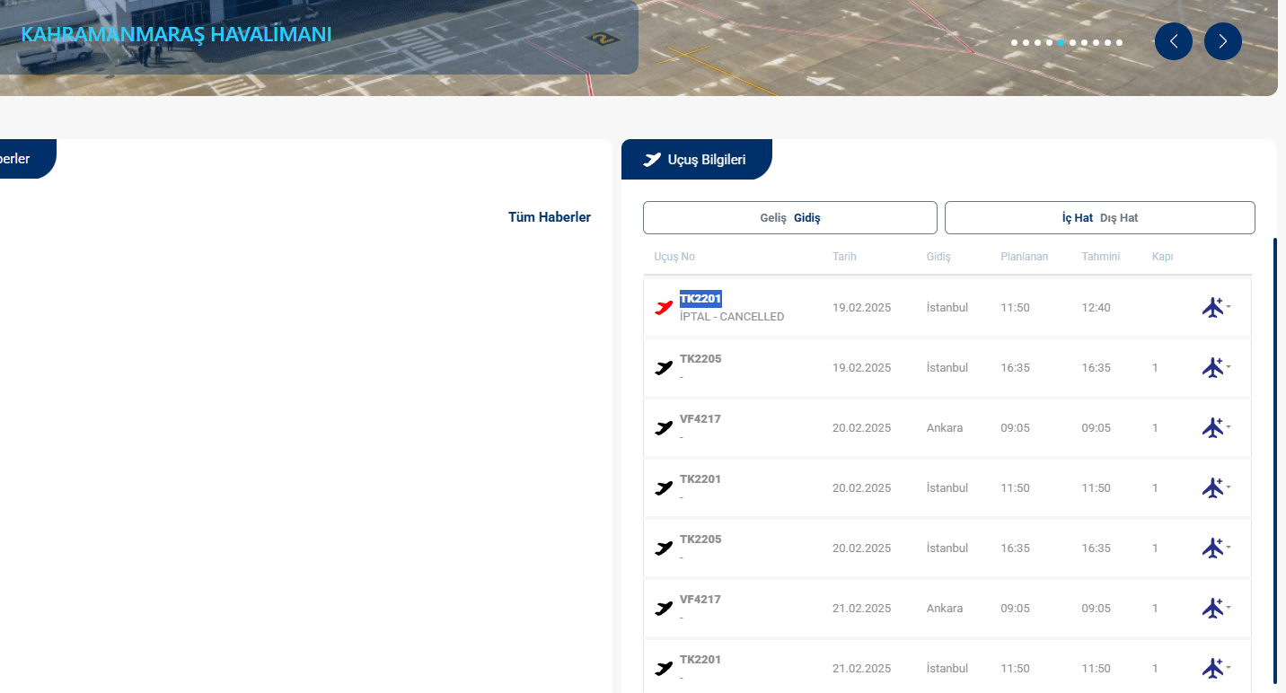 Öte yandan, Kahramanmaraş’tan İstanbul’a hareket etmesi gereken TK2201 sefer sayılı uçuş ise tamamen iptal edildi.