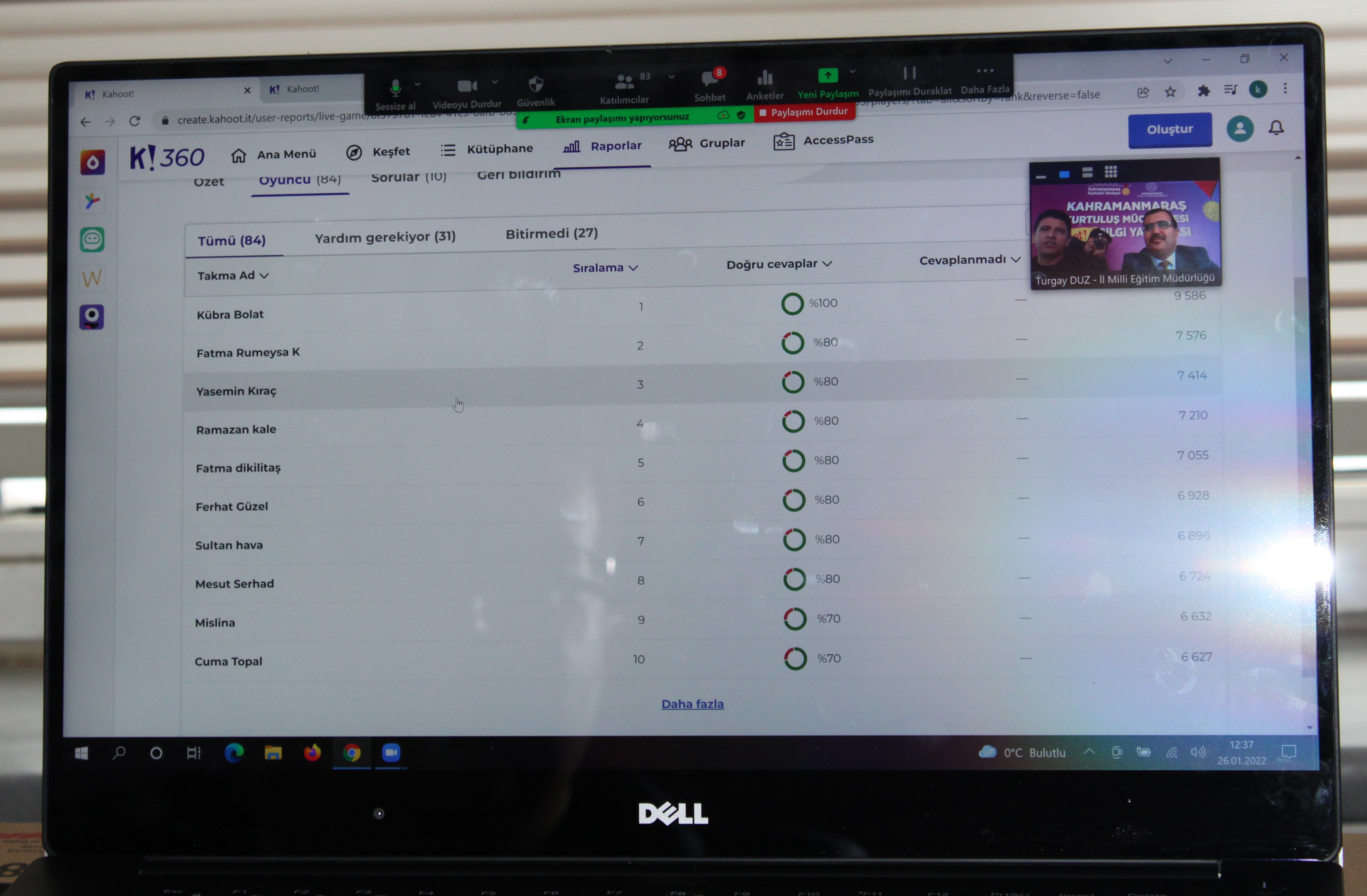 Ecdadımızın kahramanlıklarını gelecek nesillere aktarmak amacıyla Kahramanmaraş İl Millî Eğitim Müdürlüğü ve Kahramanmaraş Büyükşehir Belediyesi iş birliği ile yürütülen “Korkma! İstiklal İlham Verir” projesi kapsamında yarıyıl tatili süresince 11 ilçede ilkokul, ortaokul ve lise kategorilerinde uygulanmakta olan "Kahramanmaraş Kurtuluş Mücadelesi Kahoot Bilgi Yarışması" devam ediyor.