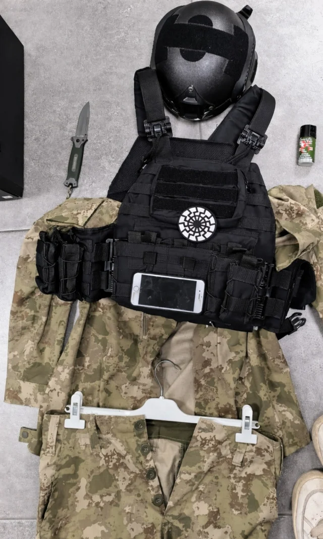 Yapılan aramalarda şahsa ait olduğu belirlenen askeri kamuflaj, hücum yeleği, kompozit başlık, biber gazı ve bıçak ele geçirildi.