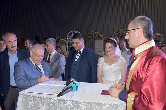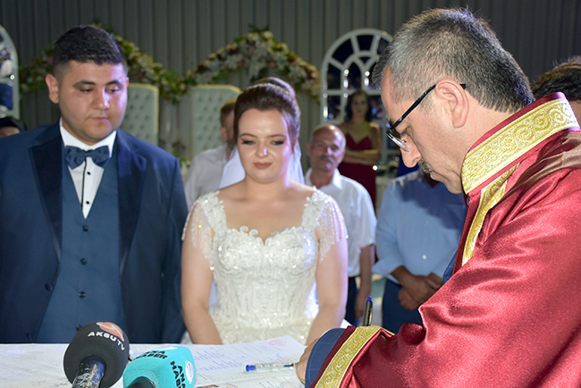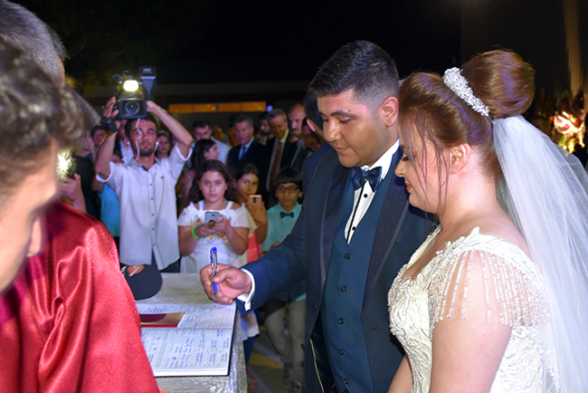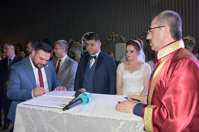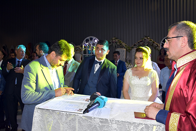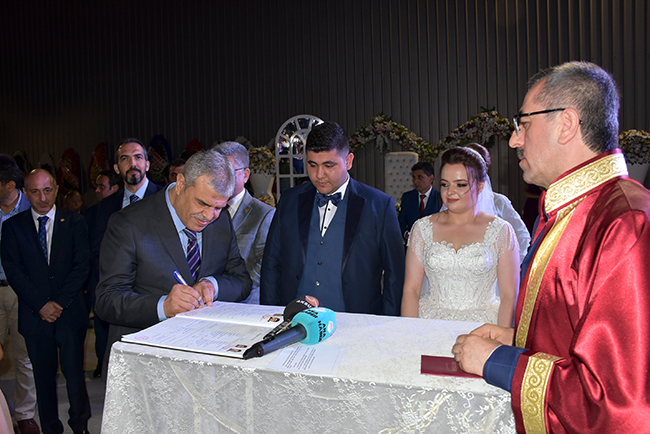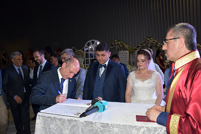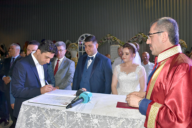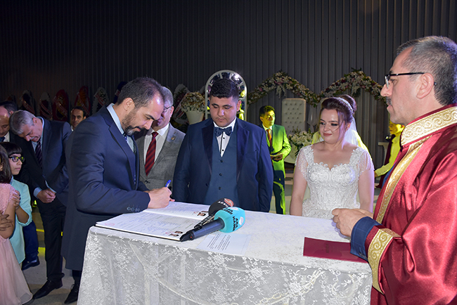 HERKESİN ÖZLEDİĞİ TABLOÇiftin nikahını ak partili kahramanmaraş Büyükşehir Belediye Başkanı Hayrettin Güngör kıydı. Nikah şahitliğini ise Ak Parti Kahramanmaraş Milletvekili Ahmet Özdemir, MHP Kahramanmaraş Milletvekili Sefer Aycan, CHP Kahramanmaraş Milletvekili Ali Öztunç, 65'nci Hükümet Başbakan Yardımcısı Veysi Kaynak, Onikişubat Belediye Başkanı Ak Partili Hanefi Mahçiçek, Dulkadiroğlu Belediye Başkanı k Partili Necati Okay, Nurhak Belediye Başkanı CHP'li İlhami Bozan, Ak Parti İl Başkanı Ömer Oruç Bilal Debgici, İyi Parti İl Başkanı Ahmet Çabukel yaptı. Hayrettin Güngör'ün sorusuna 'Evet' yanıtını veren Mehmet-Zekiye Şengül çifti daha sonra nikah defterini imzaladı.Çiftin nikah defterini imzaladıktan sonra 9 nikah şehidi sırasıyla defteri imzaladı. Nikah töreninin ardından Veysi Kaynak, genç çifte her zaman birbirlerine ve ailelerine karşı sevgi ve saygı içerisinde olmalarını tavsiye edip bir ömür mutluluklar diledikten sonra evlilik cüzdanını geline verdi.