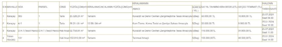 Karaçay Mahallesi'nde yer alan 365 ada 25.528,24 metrekarenin tamamı, 471 ada 26.317,87 metrekarenin 13.567,84 metrekaresi ve 52.759,94 metrekarelik alanın tamamı ile Yukarı Höcüklü Mahallesi'nde yer alan 137 ada 153.810,09 metrekarenin tamamı ihale yoluyla 5 yıllık süre ile kiraya verilecek.