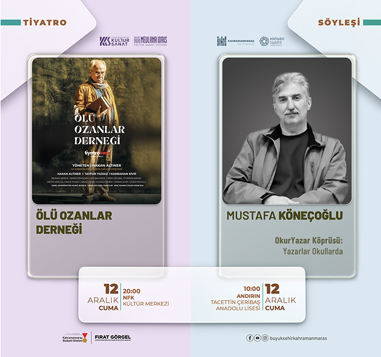 Ay boyunca Necip Fazıl Kısakürek Kültür Merkezi Araştırma Kütüphanesi, edebiyat dünyasının önemli isimlerini ağırlayacak.6 Aralık Cumartesi günü Aykut Ertuğrul ve Mehmet Cemil, 20 Aralık Cumartesi günü ise Yusuf Genç ve Mustafa Armağan okurlarıyla bir araya gelecek.27 Aralık Cumartesi günü saat 19.00’da ise “İstiklal Şairimiz: Mehmet Akif” konulu söyleşide İsmail Kara, okurlarla buluşacak. Büyükşehir Belediyesi ayrıca kültür sanat etkinliklerini ilçelere de taşıyarak Çağlayancerit’ten Andırın’a, Göksun’dan Elbistan ve Türkoğlu’na kadar pek çok noktada yazar buluşmaları düzenleyecek.