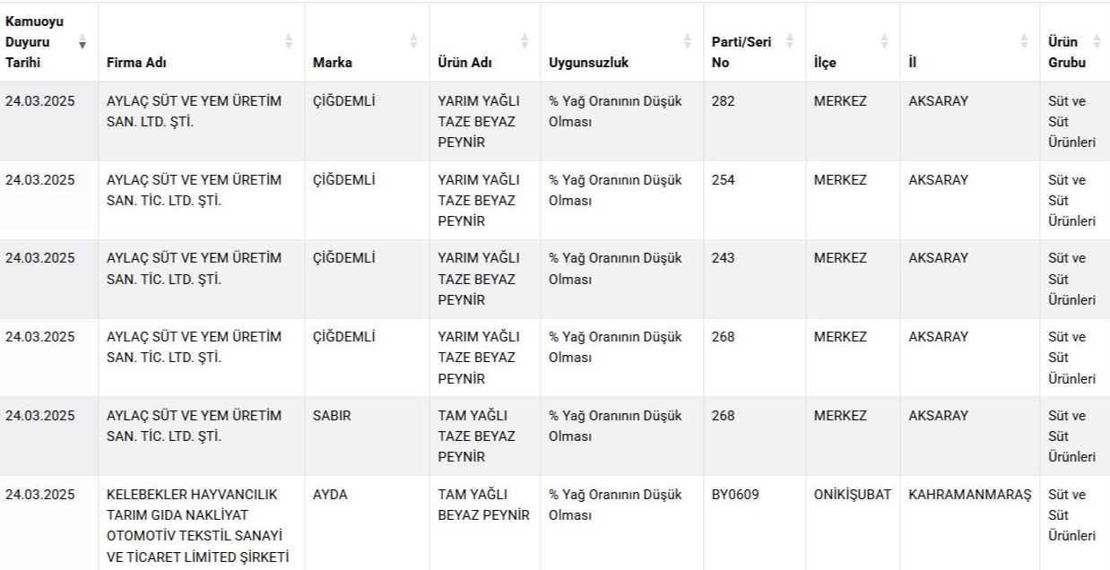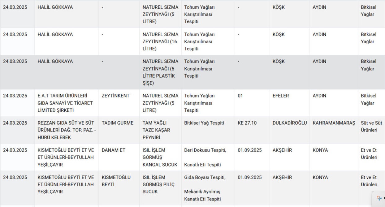 Tarım ve Orman Bakanlığı, son denetimlerin ardından gıda sektöründe hile yapan firmaların listesini 24 Mart 2025 tarihinde güncelledi.