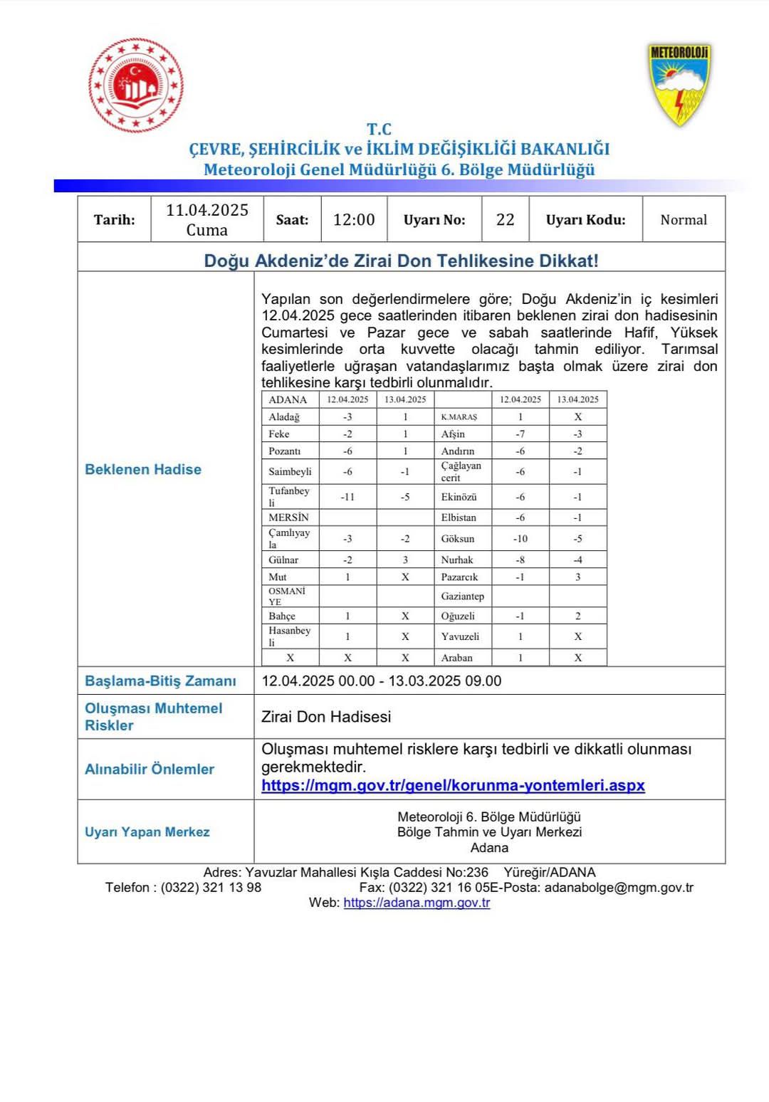 Meteoroloji yetkilileri, Kahramanmaraş genelinde zirai don riskine karşı uyarıda bulundu.
