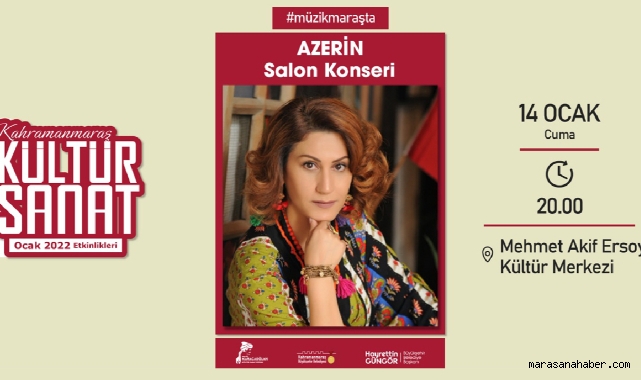 Büyükşehir Belediyesi Ocak Kültür Sanat Sezonu kapsamında 14 Ocak Cuma günü Türk müziğinin usta sesi Azerin konser etkinliğiyle Kahramanmaraş’ta sanatseverlerle buluşacak.