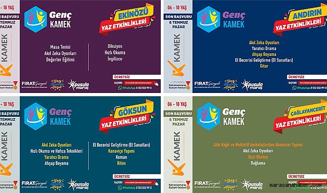 Yaz tatilini verimli, üretken ve eğitici faaliyetlerle değerlendirmek isteyen gençler için Ekinözü, Göksun, Andırın ve Çağlayancerit’teKahramanmaraş Büyükşehir Belediyesi tarafından düzenlenecek olan yaz kurslarına başvurular tüm hızıyla devam ediyor.