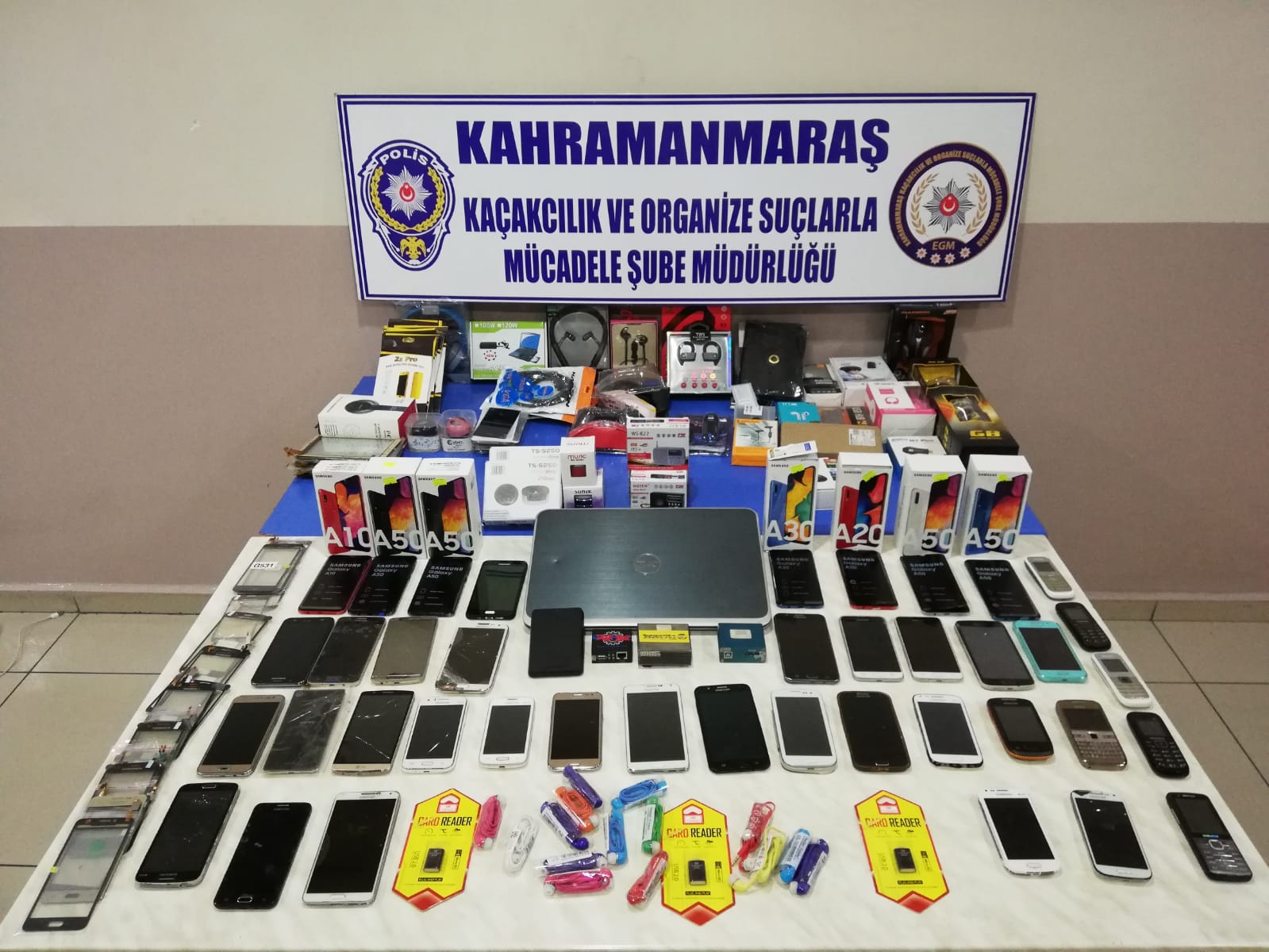 Kahramanmaraş Kaçakçılık ve Organize Suçlarla Mücadele Şube Müdürlüğü ekipleri tarafından gerçekleştirilen operasyonlarda; telefon, tablet, dokunmatik ekran laptop, hard disk gibi yüzlerce kaçak teknolojik cihaz ve ekipman ele geçirildi.Kahramanmaraş Kom Şube Müdürlüğü ekipleri tarafından kaçak cep telefonu satışının önlenmesine yönelik operasyon yapıldı. 21.08.2019 günü kahramanmaraş Kom Şube Müdürlüğü ekipleri tarafından kaçak cep telefonu satışının önlenmesine yönelik yapılan operasyon neticesinde, İl Merkezi Dumlupınar Mahallesi Sait Zarifoğlu Caddesinde iletişim üzerine faaliyet gösteren bir işyerinde arama yapıldı. Aramada 5 adet tuşlu ve 35 adet Android olmak üzere 40 adet Kaçak/Klon cep telefonu, 118 adet dokunmatik cam, kırılmaz cam ve kulaklık gibi cep telefonu aparatları, 7 adet batarya ele geçirildi. Ayrıca cep telefonlarına IMEI atmak için kullanılan 1 adet Laptop, 1 adet harici disk, 3 adet BOX cihazı ve aparatları muhafaza altına alındı. Konu hakkında 2 şüpheli yakalandı. Şüpheliler sorgulanmak üzere Emniyet Müdürlüğüne götürüldü.
