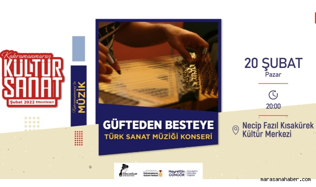 Şubat Kültür Sanat Etkinlikleri kapsamında 20 Şubat Pazar günü gerçekleştirilecek diğer bir etkinlikte ise ‘Güfteden Besteye’ isimli Türk Sanat Müziği konseri dinleyicilerle buluşacak. Necip Fazıl Kısakürek Kültür Merkezi’nde düzenlenecek olan konser saat 20.00’da başlayacak. Kültür, Spor ve Turizm Dairesi Başkanlığı’nda yapılan açıklamada, düzenlenen etkinliklere tüm vatandaşlar davet edildi.