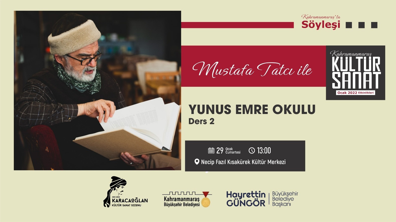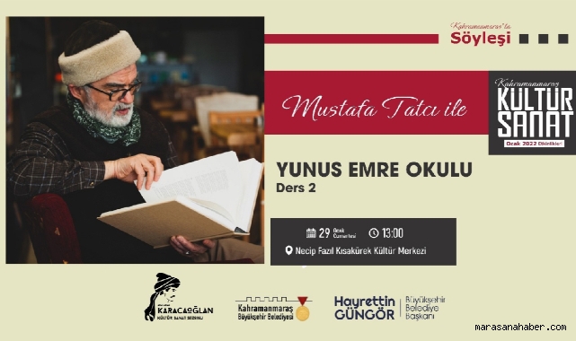 Kahramanmaraş Büyükşehir Belediyesi tarafından düzenlenen Ocak Kültür Sanat Etkinlikleri devam ediyor. Farklı alanlarda birçok programın yer aldığı Kültür Sanat Sezonu 29 Ocak Cumartesi günü (yarın) düzenlenecek iki etkinlikle sürecek. Necip Fazıl Kısakürek Kültür Merkezi’nde düzenlenecek ilk etkinliğin konuğu Yazar Mustafa Tatcı olacak. Yazar Tatcı’nın gerçekleştireceği Yunus Emre Okulu adlı söyleşi saat 13.00’da başlayacak.