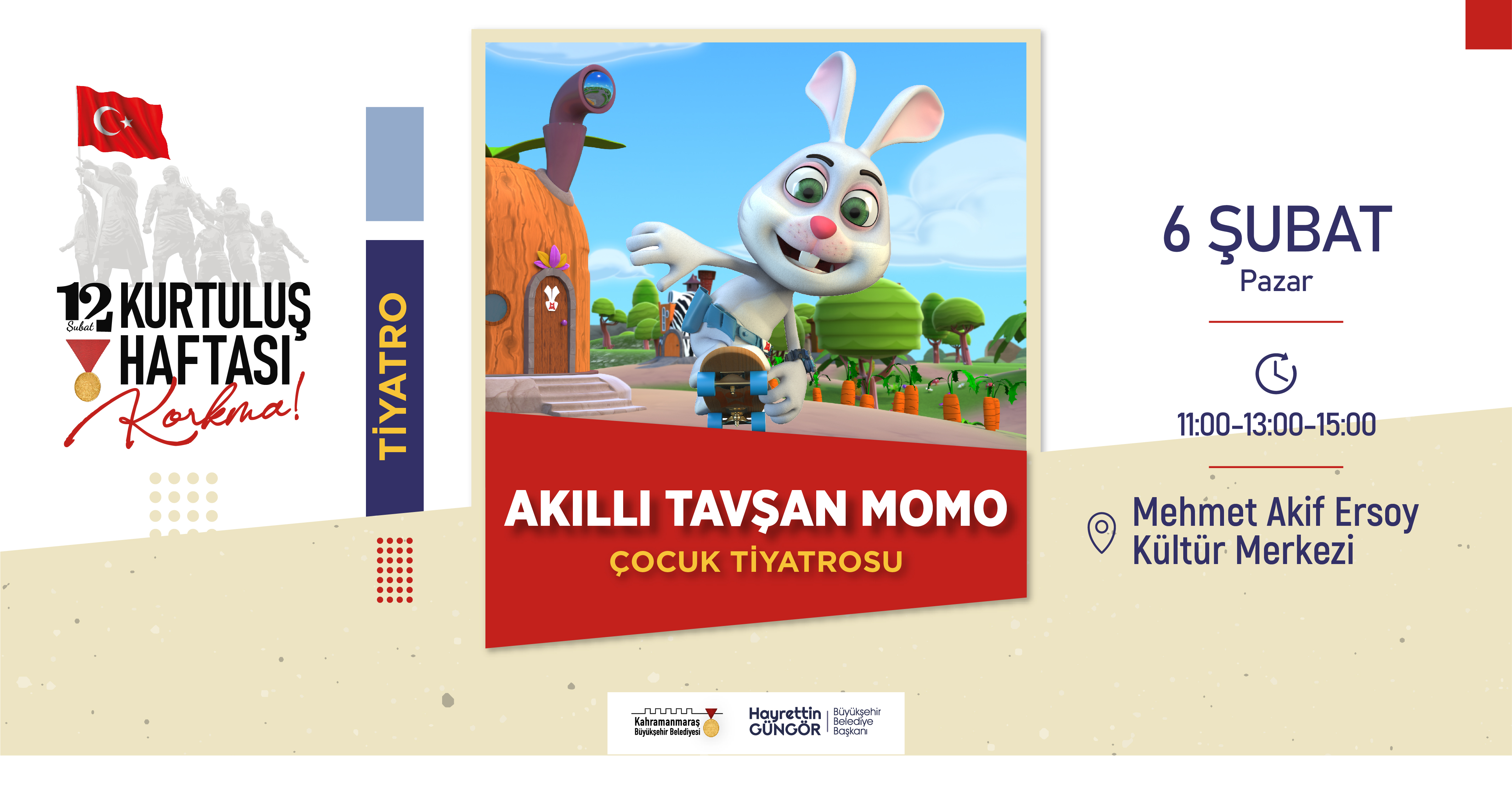 Saat 11.00-13.00-15.00: Mehmet Akif Ersoy Kültür Merkezi’nde ‘Akıllı Tavşan Momo’ isimli çocuk tiyatrosu sahne alacak.