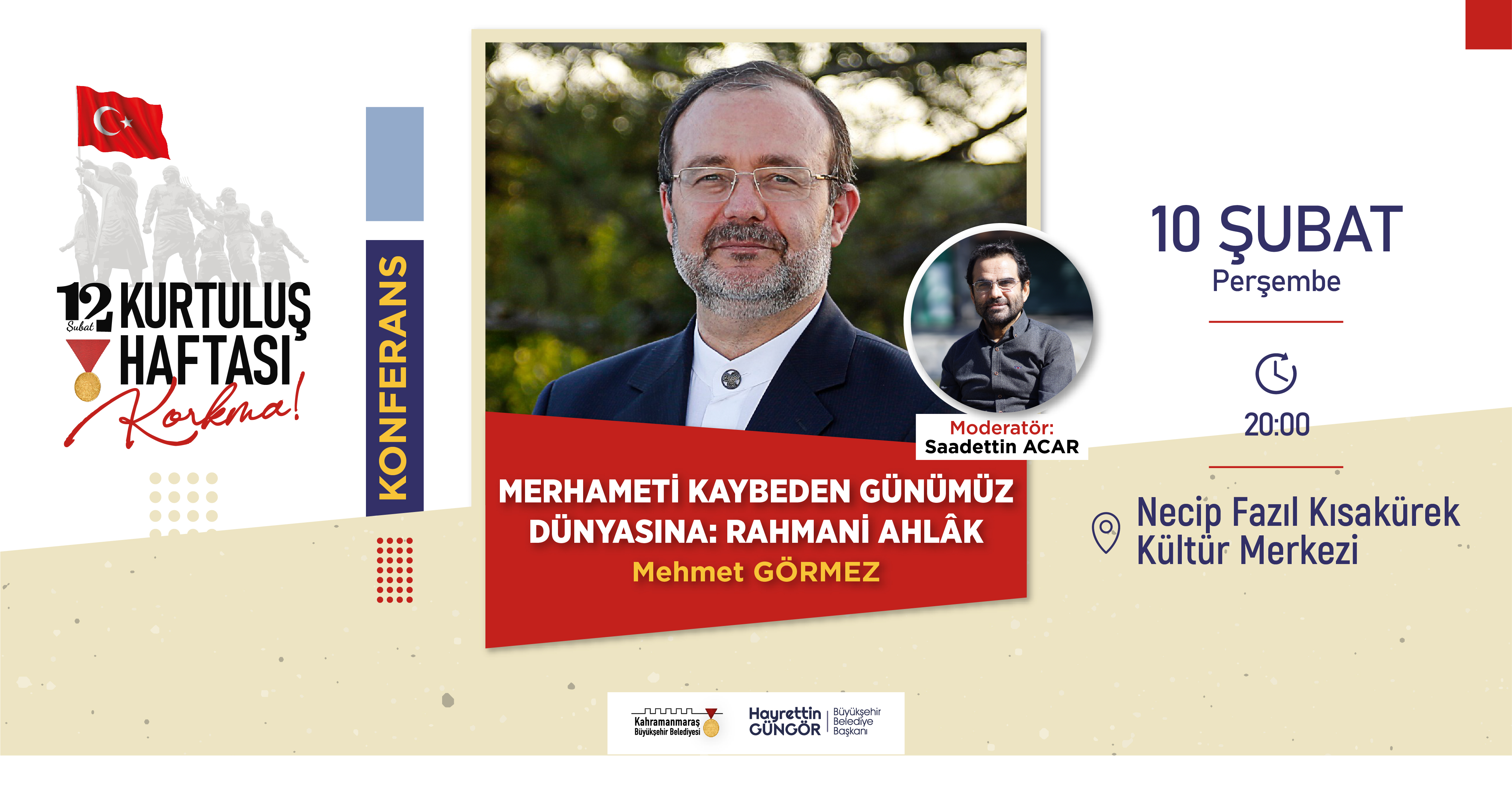Saat 20.00: Necip Fazıl Kısakürek Kültür Merkezi’nde Prof. Dr. İlyas Gökhan ve Doç. Dr. Erhan Alparslan’ın konuk olacağı ‘Maraş Milli Mücadelesi ve Şehrimize Kahramanlık Unvanı Verilişi’ isimli panel düzenlenecek.