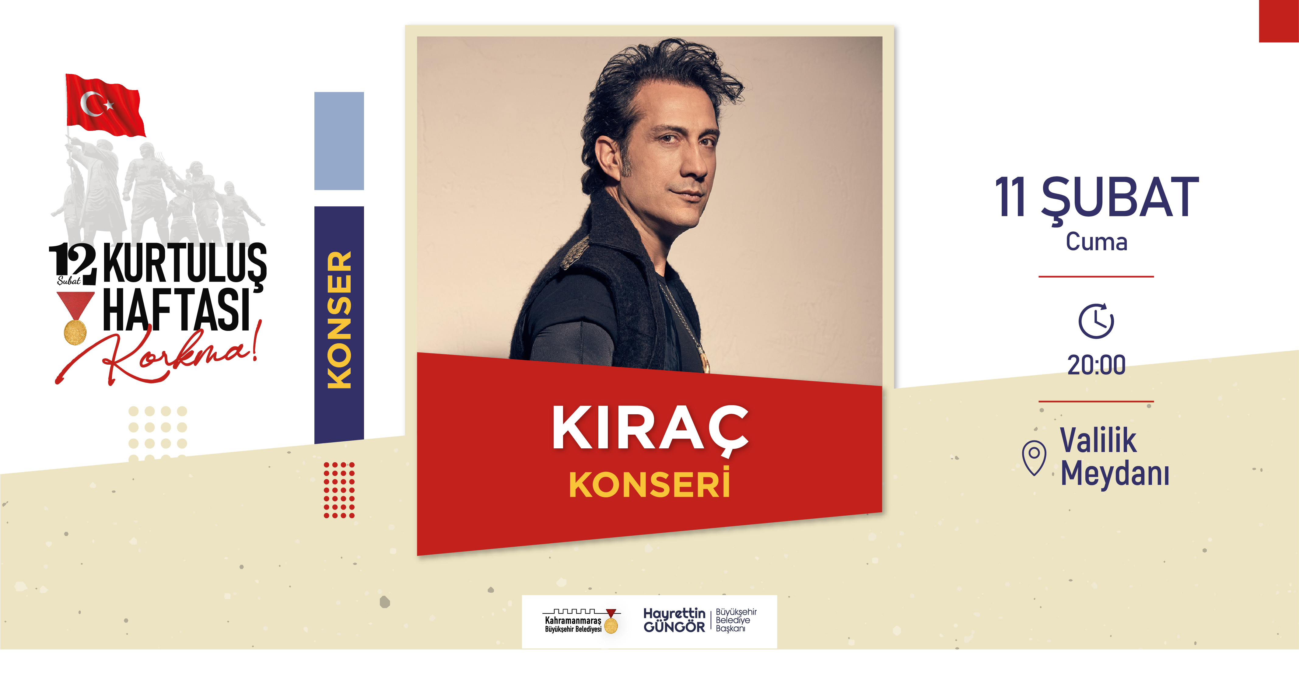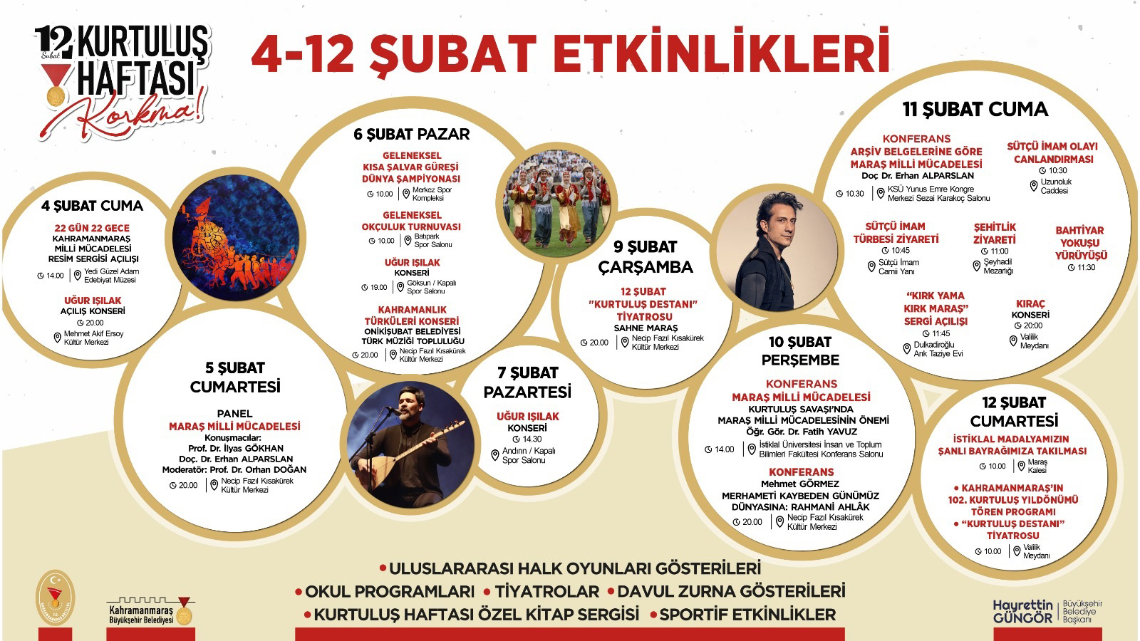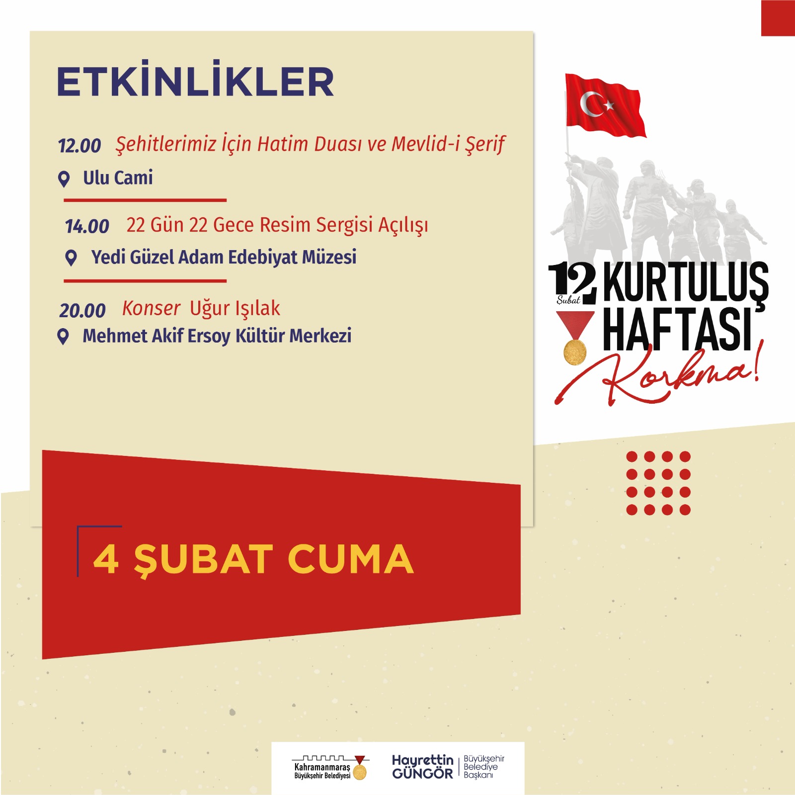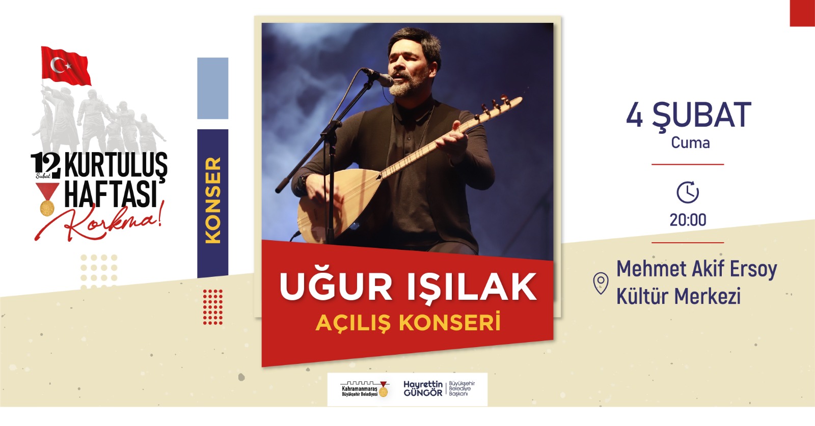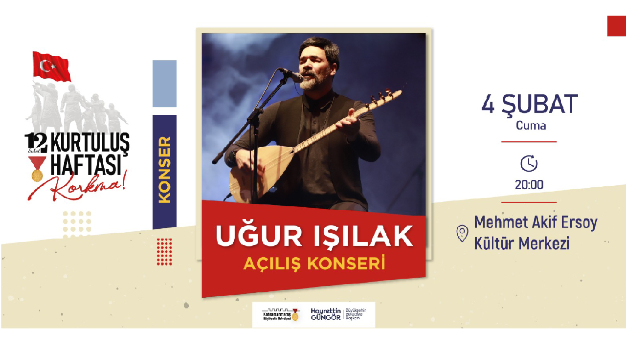 Kahramanmaraş Büyükşehir Belediyesi tarafından hazırlanan Milli Mücadelenin 102. yıldönümü etkinlikleri başlıyor. 4 – 12 Şubat Kurtuluş Haftası kapsamında gerçekleştirilecek etkinliklerle tiyatrodan belgesel gösterimine, konserden söyleşi ve panele birçok etkinlik Kahramanmaraşlılarla buluşturulacak. Etkinlik takvimi kapsamında ilk program 4 Şubat Cuma günü gerçekleştirilecek. Sevilen sanatçı Uğur Işılak, Mehmet Akif Ersoy Kültür Merkezi’nde Kahramanmaraşlılarla buluşacak.