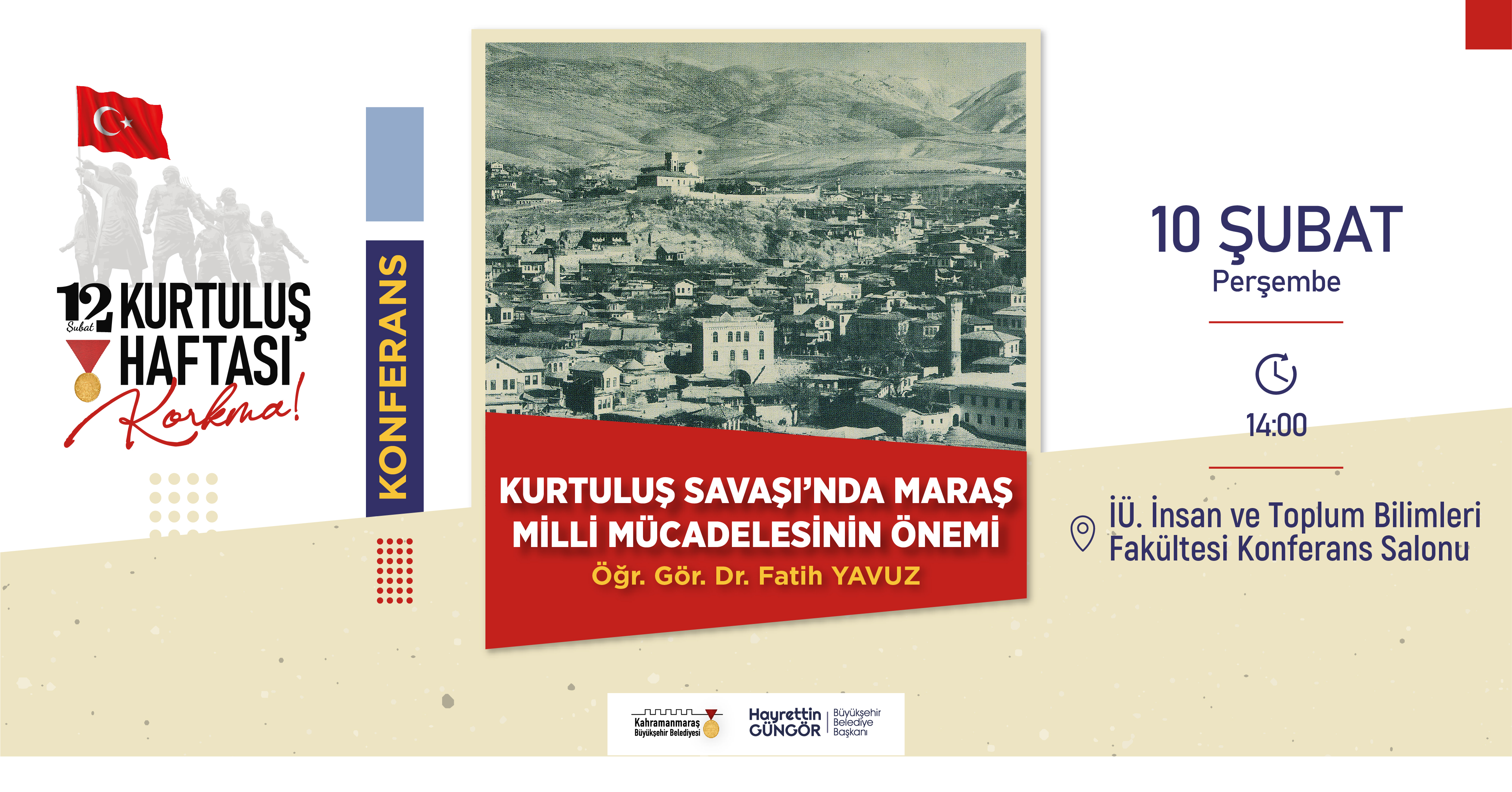Saat 14.00: İstiklal Üniversitesi İnsan ve Toplum Bilimleri Fakültesi Konferans Salonu’nda Ögr. Gör. Dr. Fatih Yavuz, ‘Kurtuluş Savaşı’nda Maraş Milli Mücadelesinin Önemi’ isimli konferans düzenleyecek.