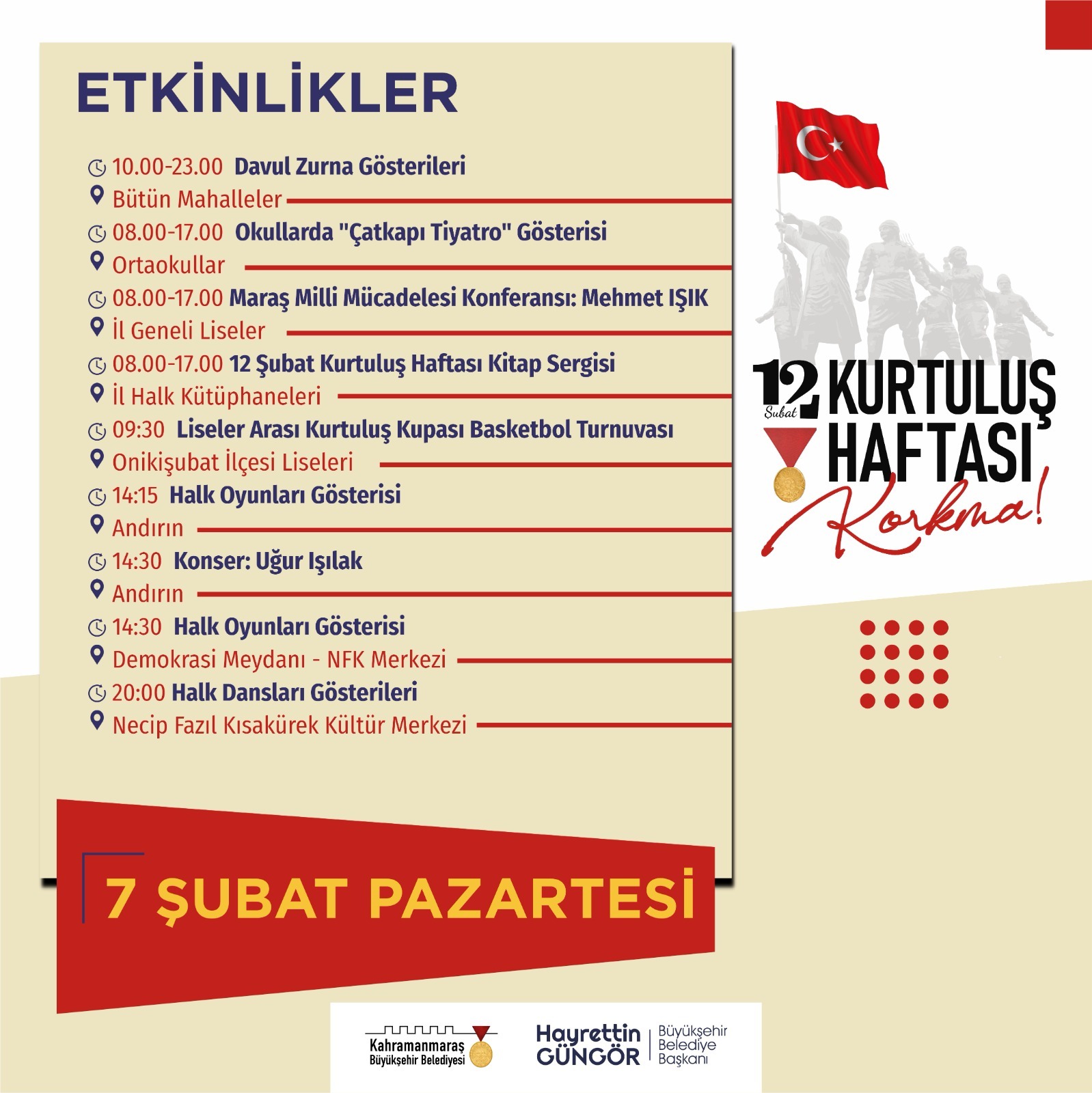 Kahramanmaraş Büyükşehir Belediyesi tarafından 12 Şubat Kurtuluş Haftası kapsamında düzenlenen etkinlikler hız kesmeden sürüyor. ‘Korkma’ temalı Kurtuluş Haftası dördüncü gününde birbirinden farklı etkinliklerle devam edecek. 7 Şubat Pazartesi günü etkinlik takvimi kapsamında şehir merkezinde bütün mahallelerde davul zurna gösterileri düzenlenecek. Yine aynı gün il genelindeki ortaokullarda Sahne Maraş oyuncularının canlandıracağı ve milli mücadele kahramanların anlatıldığı ‘Çatkapı Tiyatro’ isimli oyun sahnelenecek. İl genelindeki liselerde ise tarihçi yazar Mehmet Işık tarafından ‘Maraş Milli Mücadelesi’ konferansı verilecek. 7 Şubat Pazartesi günü düzenlenecek diğer bir etkinlikte ise İl Halk Kütüphanelerinde kitap sergisinin açılışı gerçekleştirilecek. Etkinlik takvimi kapsamında saat 09.30’da Şehit Zekeriya Boyar Spor Salonu’nda Onikişubat ilçesinde bulunan liseler arası Kurtuluş Kupası Basketbol Turnuvası düzenlenecek.