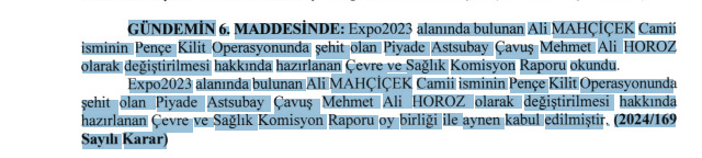Karar, mecliste oy birliğiyle kabul edildi.Toplantının gündeminde yer alan 6. madde, Çevre ve Sağlık Komisyonu tarafından hazırlanan raporun okunmasıyla ele alındı. Raporda, şehit Mehmet Ali Horoz’un adının yaşatılması amacıyla caminin isminin değiştirilmesi önerildi. Meclis üyeleri değişikliği oy birliğiyle onayladı.