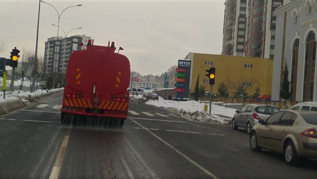 Büyükşehir Belediyesi tarafından 220 araç ve 600’ün üzerinde personelle gerçekleştirilen kış şartlarıyla mücadele çalışmalarında, beklenen yoğun kar yağışı öncesi arterlerdeki olası buzlanmaya karşı solüsyon ve tuzlama uygulamaları sürüyor.