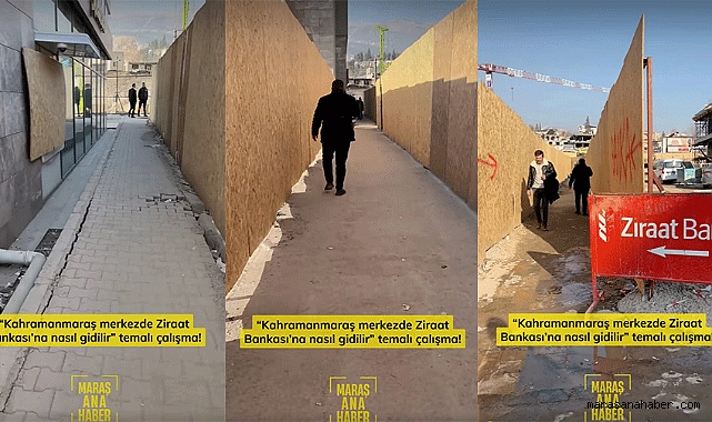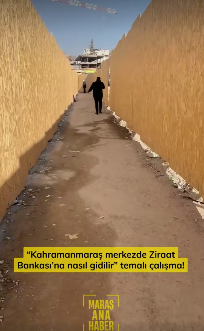 Kahramanmaraş’ta inşaat çalışmalarının ortasında kalan Ziraat Bankası için oluşturulan labirent yol görenleri şaşırtıyor.