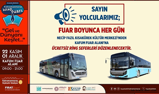 Büyükşehir Belediyesi, edebiyatseverlerin 9. Uluslararası Kahramanmaraş Kitap Fuarı’na daha rahat ulaşım sağlaması için NFK Kültür Merkezi ve KAFUM arasında ücretsiz ring seferleri düzenleyecek.