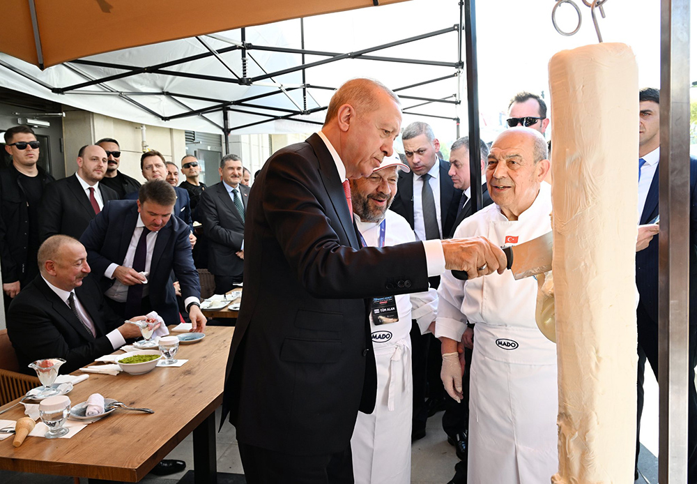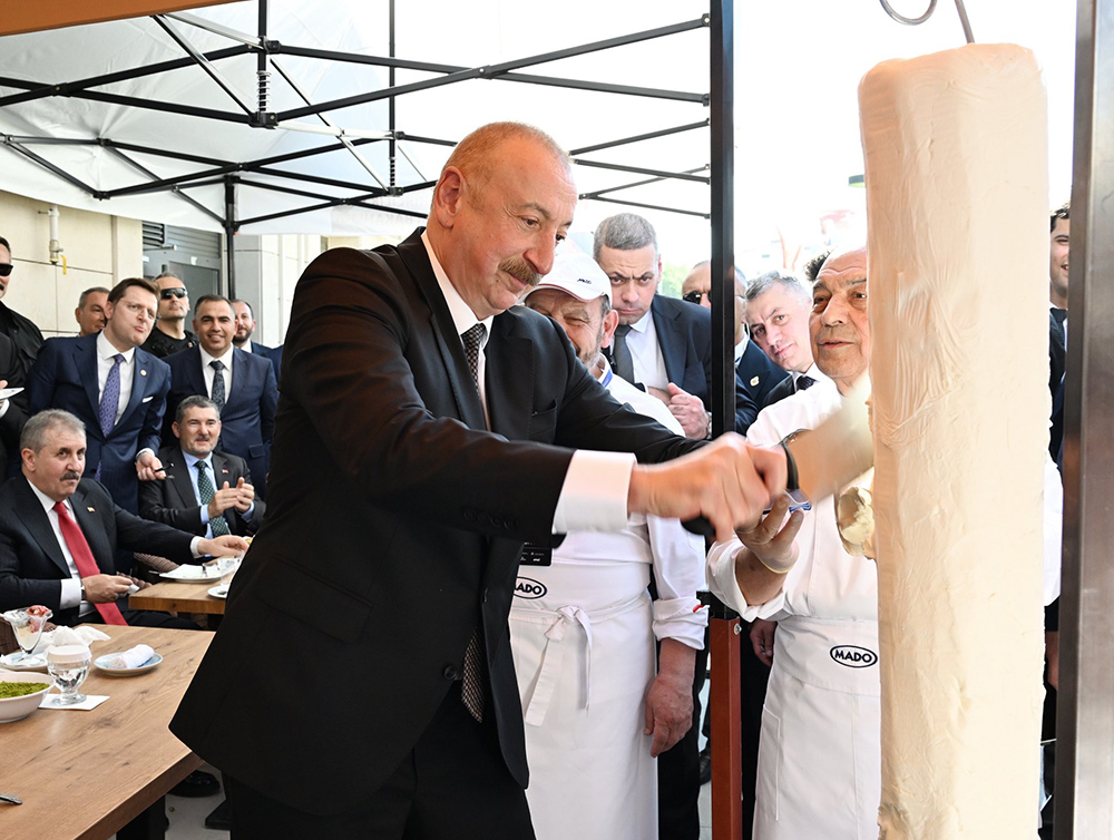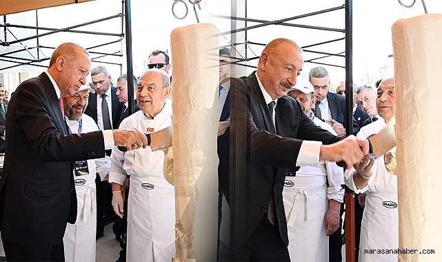 Vatandaşlar tarafından coşkuyla karşılanan liderlere sürpriz dondurma ikramı yapıldı. Ünlü Maraş dondurmasının kesme ritüeline özel bir şovla eşlik eden dondurmacılar, Cumhurbaşkanı Erdoğan ve Aliyev’e satır da uzattı.