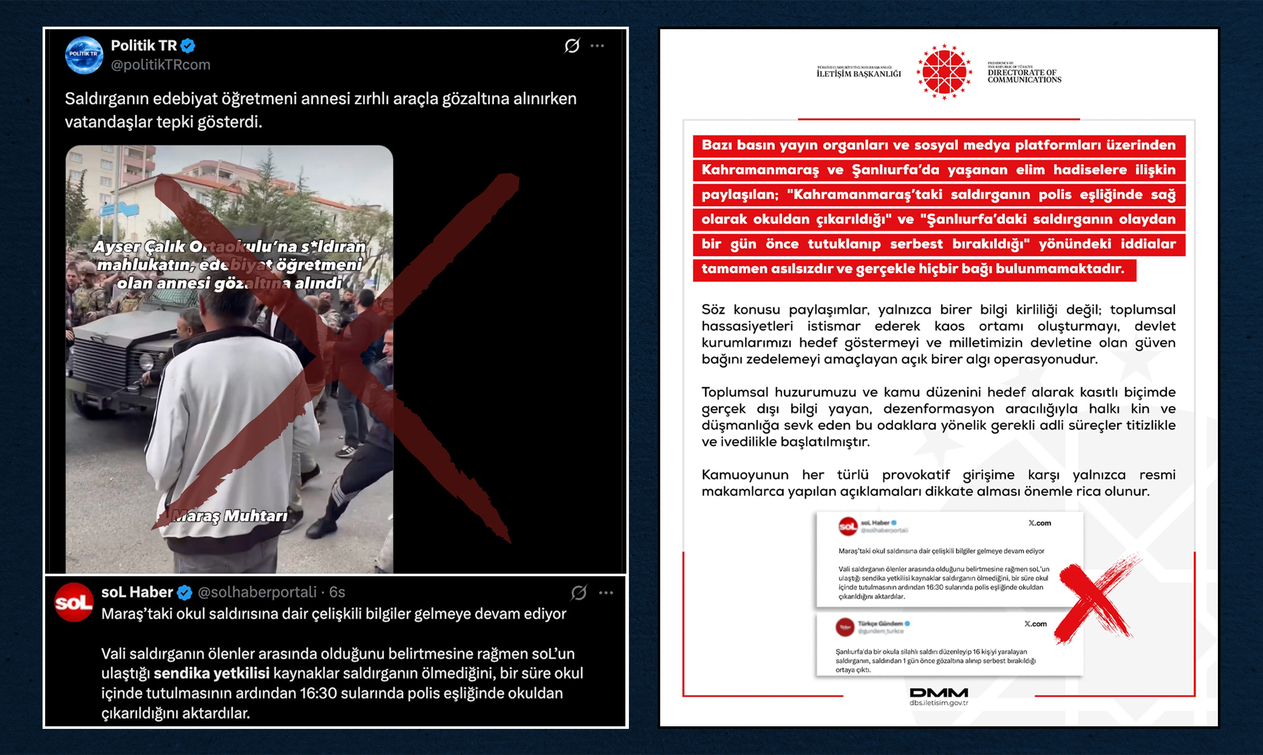 Cumhurbaşkanlığı İletişim Başkanlığı Dezenformasyonla Mücadele Merkezi (DMM); basın yayın organları ve sosyal medya platformları üzerinden Kahramanmaraş ve Şanlıurfa'da yaşanan saldırılara ilişkin paylaşılan, "Kahramanmaraş'taki saldırganın polis eşliğinde sağ olarak okuldan çıkarıldığı" ve "Şanlıurfa'daki saldırganın olaydan bir gün önce tutuklanıp serbest bırakıldığı" yönündeki iddiaların gerçekle hiçbir bağı bulunmadığını bildirdi: