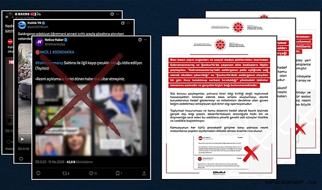"Bazı basın yayın organları ve sosyal medya platformları üzerinden Kahramanmaraş ve Şanlıurfa'da yaşanan elim hadiselere ilişkin paylaşılan 'Kahramanmaraş'taki saldırganın polis eşliğinde sağ olarak okuldan çıkarıldığı' ve 'Şanlıurfa'daki saldırganın olaydan bir gün önce tutuklanıp serbest bırakıldığı' yönündeki iddialar tamamen asılsızdır ve gerçekle hiçbir bağı bulunmamaktadır.