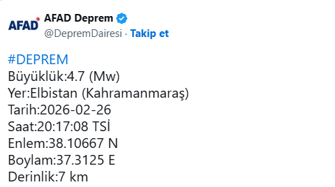 Afet ve Acil Durum Yönetimi Başkanlığı (AFAD) tarafından paylaşılan bilgilere göre, saat 20.17’de kaydedilen depremin büyüklüğü 4,7 olarak açıklandı.