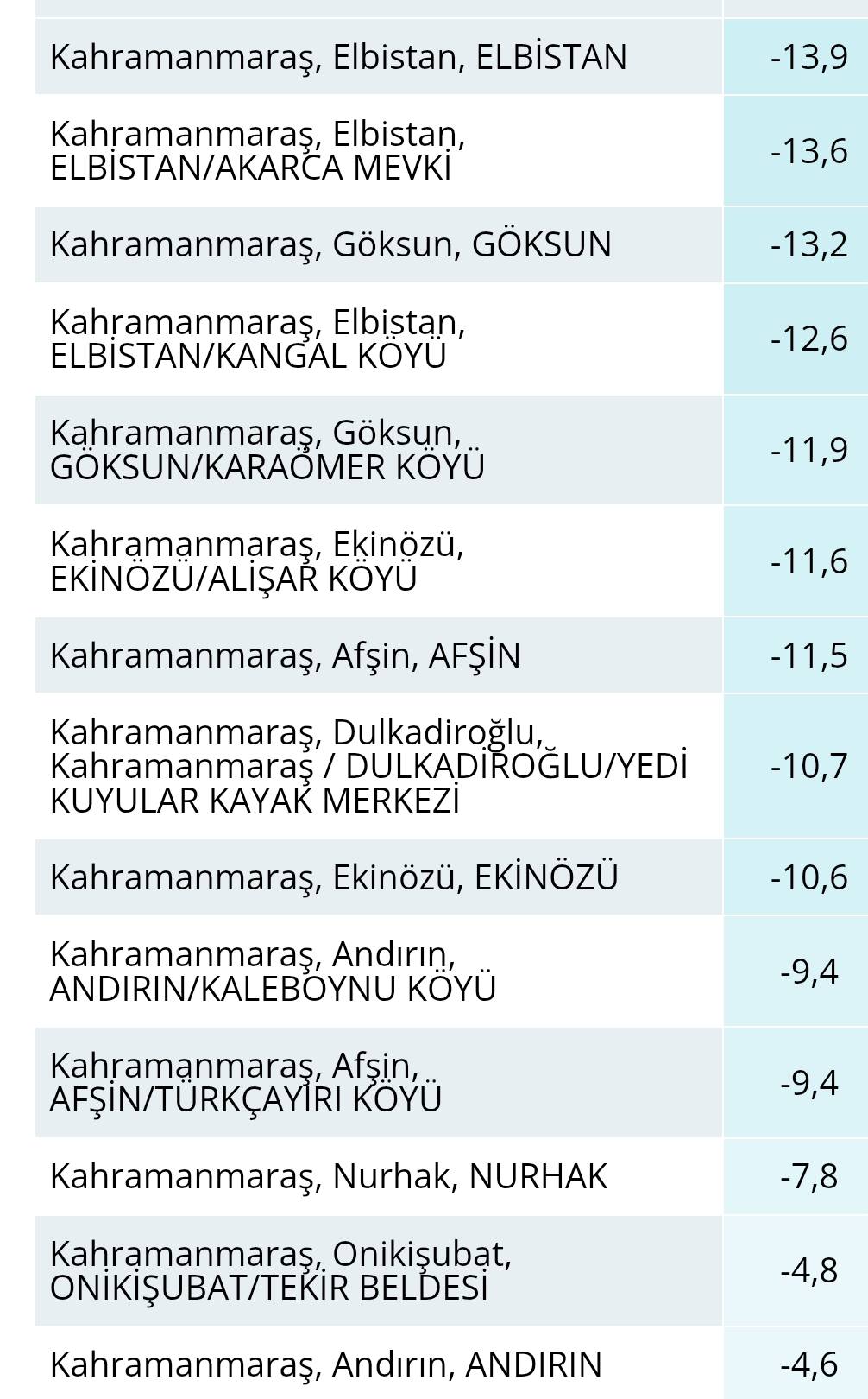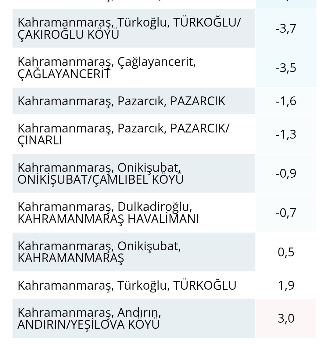 Meteoroloji verilerine göre, Onikişubat, Türkoğlu, Pazarcık, Göksun, Afşin, Çağlayancerit, Nurhak, Ekinözü ve Elbistan başta olmak üzere birçok ilçede hava sıcaklığı eksi derecelere kadar geriledi.