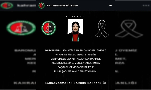 Kahramanmaraş Barosu üyesi, 1439 sicil numarasına sahip Avukat Halise Özkul’un vefat ettiği duyuruldu.Kahramanmaraş Barosu, Halise Özkul'un kaybını üzülerek duyurdu. Baro, sosyal medya hesabından yaptığı açıklamada, "Başımız sağ olsun" diyerek, avukatlarının vefatını üzüntüyle bildirdi.Açıklamada, "Baromuzun 1439 sicil sırasında kayıtlı üyemiz Av. Halise Özkul vefat etmiştir. Merhumeye Cenab-ı Allah’tan rahmet, kederli ailesine, meslektaşlarımıza başsağlığı ve sabır dileriz. Ruhu şad, mekânı cennet olsun" ifadelerine yer verildi.
