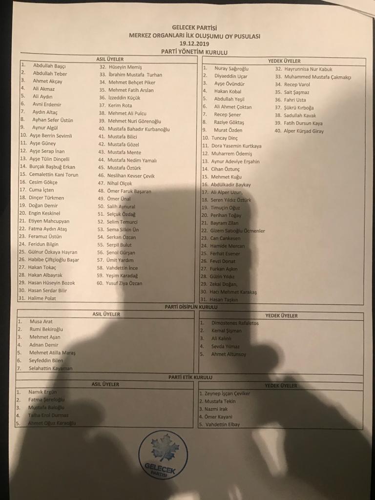 Gelecek Partisi’nin merkez organlarının oluşumu için bugün yapılan oylamada, Kahramanmaraşlı üç isim A takımında yer aldı.Gelecek Partisi, bugün merkez organlarının ilk oluşumu için sandığa gitti. Parti Yönetim Kurulu 60 asil, 40 yedek isimden oluşurken; Parti Disiplin Kurulu’nda 7 asil, 5 üye yer aldı. Kahramanmaraşlı isimlerden Sadullah Kavak, Yönetim Kurulu yedek üyesi oldu. Fatma Şerefoğlu, Parti Etik Kurulu Asil üye olurken; Zeynep İşcan Çevikleri Yedek isimler arasında ilk sırada yer aldı.İşte Gelecek Partisi’nin İlk Oluşumu ve Parti Yönetim Kurulu: