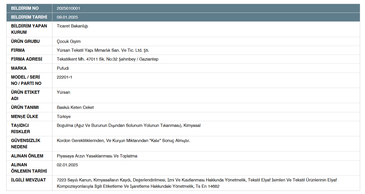 Aynı zamanda "Mavi Pelüş Oyuncak-Huggy Wuggy" adlı pelüş oyuncak, mekanik ve fiziksel güvenlik testlerinden geçemeyerek, oyuncak güvenliği yönetmeliği gereği toplatılmak üzere geri çağrıldı.Çocuk giyiminde ise, "Pufudi" markalı ve seri numarası 22201-1 olan baskılı keten ceket, kurşun miktarı ve kordon gereklilikleri bakımından tehlike arz ettiği için bakanlık tarafından piyasaya arzı yasaklandı.