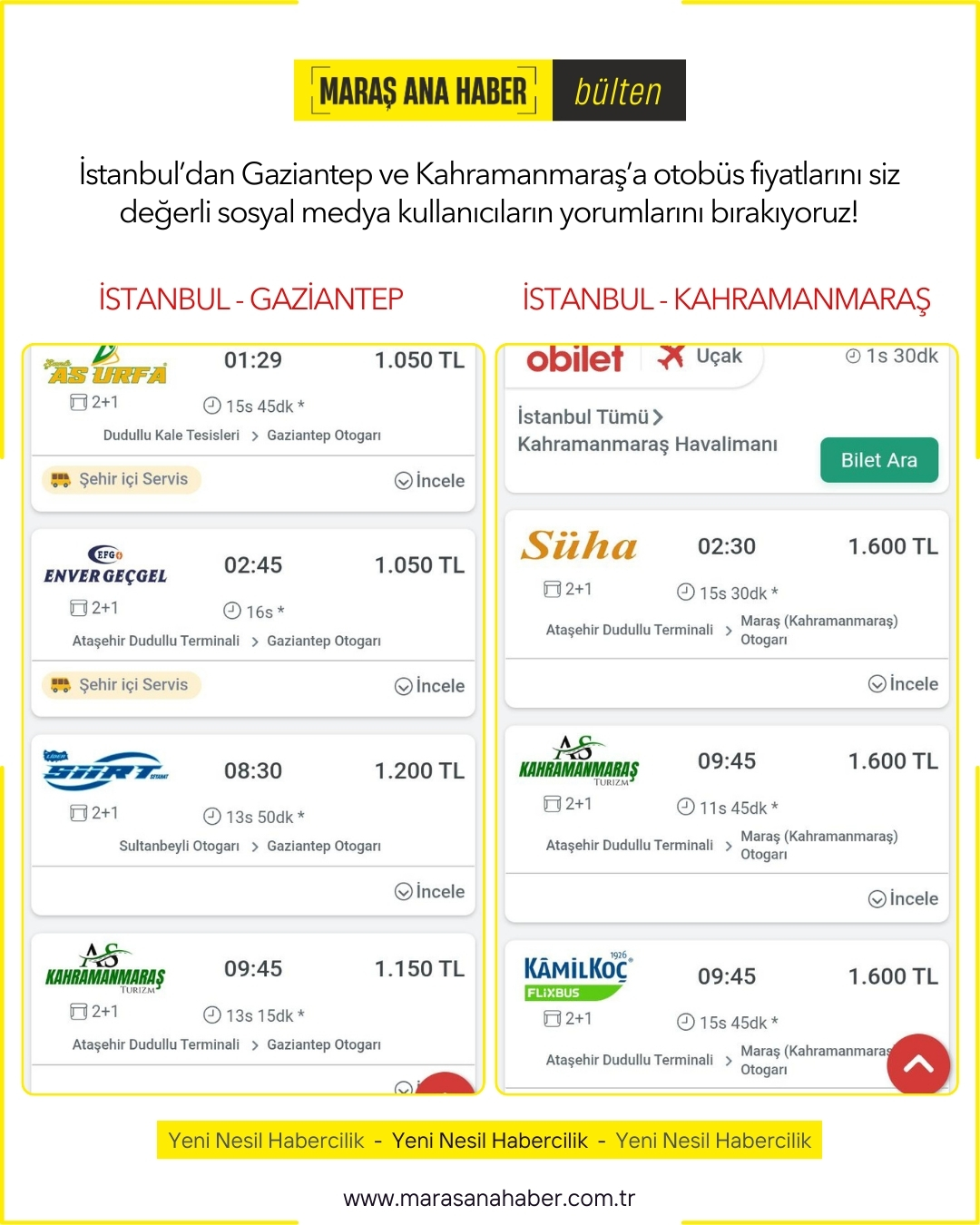Üstelik söz konusu fiyat farkını oluşturan firma bir Kahramanmaraş firması… Kendi şehrinden kalkışta daha yüksek ücret alan aynı firma, Gaziantep çıkışlı seferlerde çok daha uygun fiyat uyguluyor.