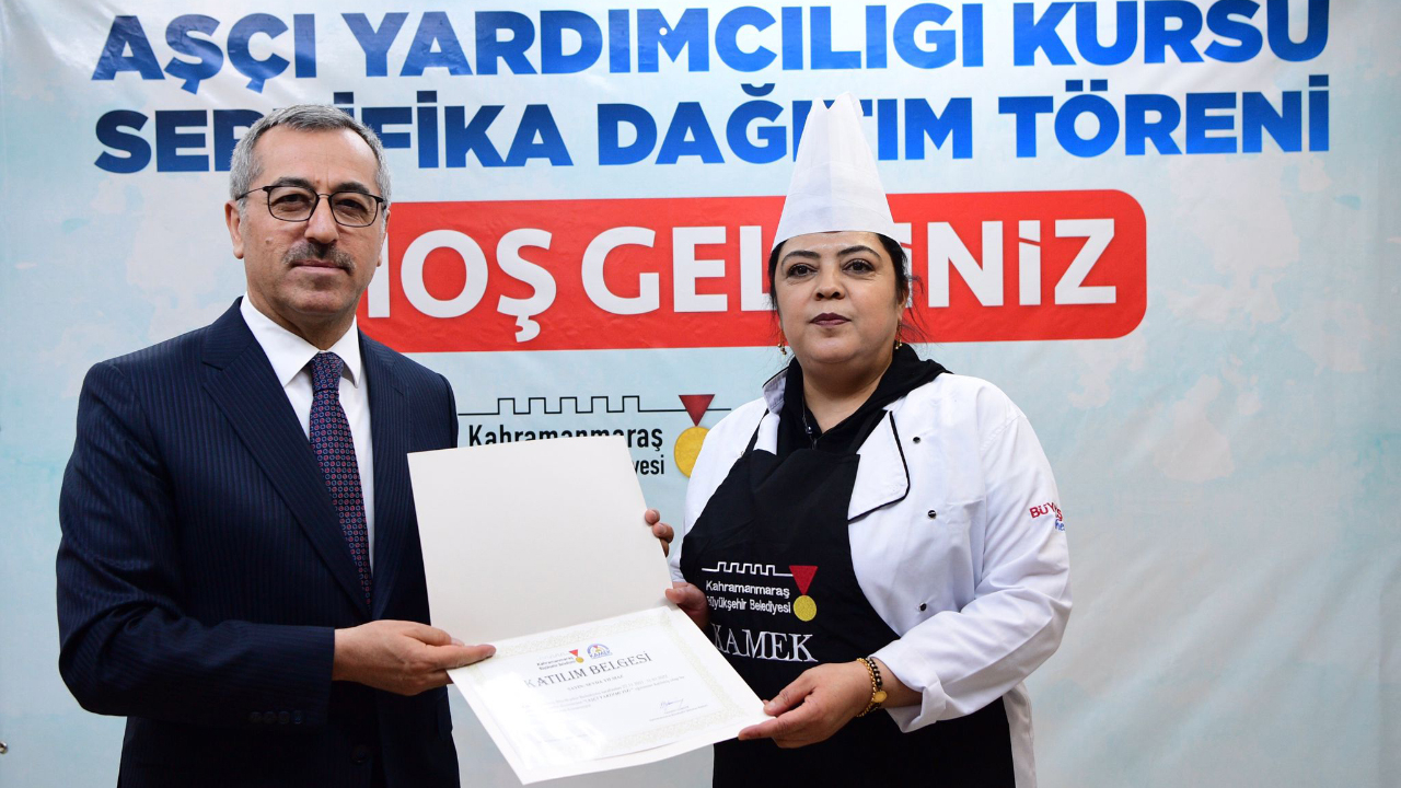 Düzenlenen sertifika takdim töreninin ardından konuşan Başkan Hayrettin Güngör, “KAMEK’lerimiz şehrimizde çok önemli hizmetler gerçekleştiriyor. Çocuklar, gençler, kadınlar ve yaşlılara yönelik çok güzel faaliyetlerimiz var. Bugün de KAMEK’ten 20 öğrencimizi mezun etmiş olduk. Kursiyerlerimiz aldıkları sertifikalarla Aşçı Yardımcısı unvanına kavuştular. Yeni aşçı yardımcılarımız bugün için güzel bir menü oluşturmuşlar. Bu kapsamda Kahramanmaraş’ımızın yöresel tarhana çorbasını birlikte pişirdik. Ben tüm eğitimcilerimize teşekkür ediyorum. Kursiyerlerimize de yeni mesleki hayatlarında başarılar diliyorum. İnşallah bu alandaki faaliyetlerimizi artırarak sürdüreceğiz” ifadelerini kullandı.