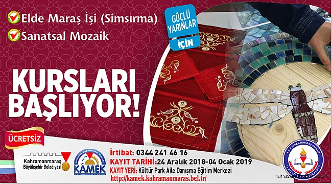 Kahramanmaraş Büyükşehir Belediyesi Meslek Edindirme ve Sanat Eğitimi Kurs Merkezi’nde (KAMEK) kışa özel dönemlik kurs kayıtları başlıyor.İnsanların el becerilerini geliştirme ve meslek edinmelerini sağlamak amacıyla düzenlenen KAMEK kursları adeta bir halk üniversitesi gibi 7’den 70’e hizmet sunmaya devam ediyor.Kahramanmaraş Büyükşehir Belediyesi Kadın Aile Şube Müdürlüğü bünyesinde verilecek olan KAMEK kurslarına kayıtlar 24 Aralık 2018-4 Ocak 2019 tarihleri arasında yapılacak.Kahramanmaraş Büyükşehir Belediyesi Kadın Aile Şube Müdürlüğü bünyesinde hizmet veren Aile Danışma Merkezlerinde verilecek olan kurslar için kayıtlar da yine bu merkezlere yapılacak.Elde Maraş işi (Sim-Sırma) Kursu ve Sanatsal Mozaik Kurslarına katılmak isteyenler Kültür Park Aile Danışma Merkezi’ne 24 Aralık 2018 – 4 Ocak 2019 tarihleri arasında müracaat edebilecekler.Takı Tasarım, Elde Maraş İşi (Sim-Sırma) ve Çeyiz Ürünleri Hazırlama kurslarına katılmak isteyenler Karaziyaret Aile Danışma Merkezine 24 Aralık 2018-4 Ocak 2019 tarihleri arasında başvurarak kayıt yaptırabilirler.Çeyiz Ürünleri Hazırlama, Yoğunlaştırılmış Temel Düzey Okuma Yazma Eğitim Programlarına katılmak isteyenler ise Gülsüm Hanım Gümüşer Aile Danışma Merkezi’ne 24 Aralık 2018-4 Ocak 2019 tarihleri arasında kayıt yaptırabilecekler.