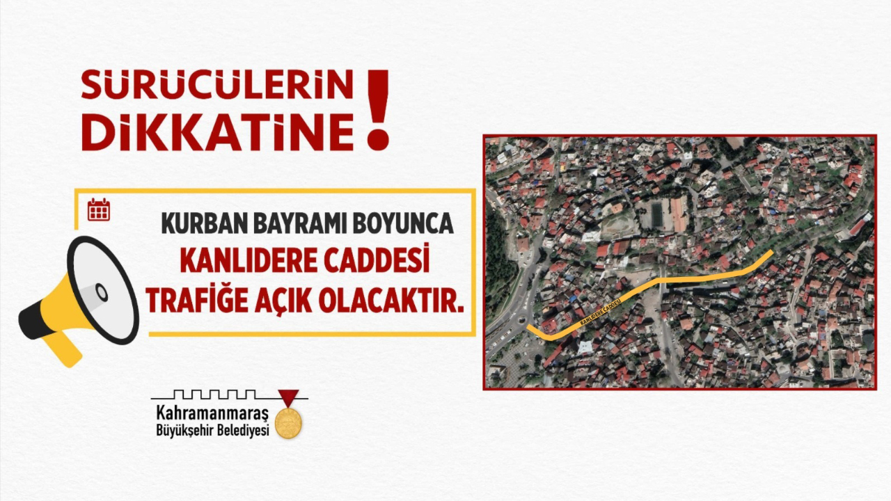 Kahramanmaraş Büyükşehir Belediyesi, Kurban Bayramı’nda şehir içi trafikte meydana gelebilecek aksamalara mahal vermemek için Kanlıdere Caddesi’nin bayram boyunca trafiğe açık olacağını duyurdu. Karara ilişkin yapılan açıklamada, “Şehir içi trafikte meydana gelebilecek aksamalara mahal vermemek adına Kanlıdere Caddesi, Kurban Bayramı süresince trafiğe açık olacaktır. Muhtemel trafik yoğunluğunda herhangi bir olumsuzluk yaşanmaması için sürücülerimizin trafikte dikkatli olmaları önem arz etmektedir” ifadelerine yer verildi.