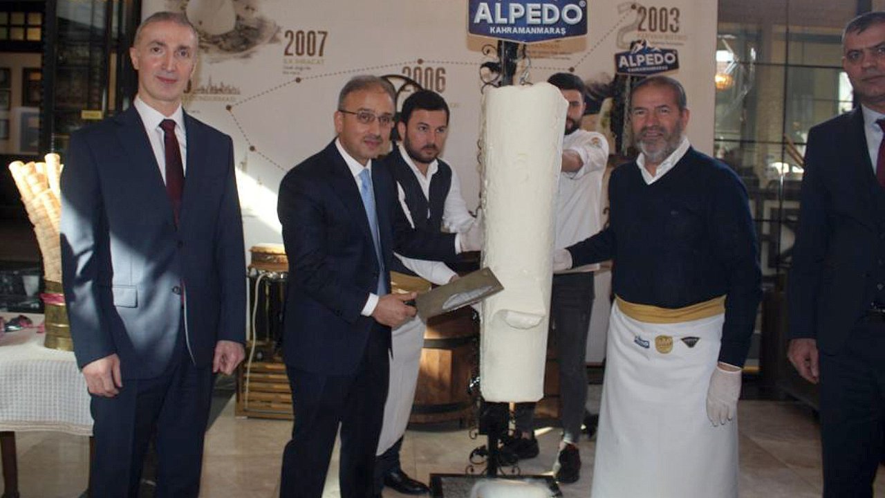 Tesiste Bakan yardımcısı Yılmaz çengelle asılan Alpedo Maraş dondurmasını satırla kesti. Kervancıoğlu ise kesilen dondurmayı külahla Yılmaz’a ikram etti.