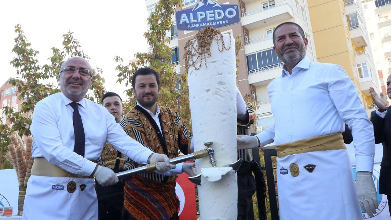 Konuşmalarının ardından Kervancıoğlu, 175 kilogramlık dondurmayı satırla kesti. Kesilen dondurmalar ise programa katılan 3 bin öğrenciye ikram edildi.