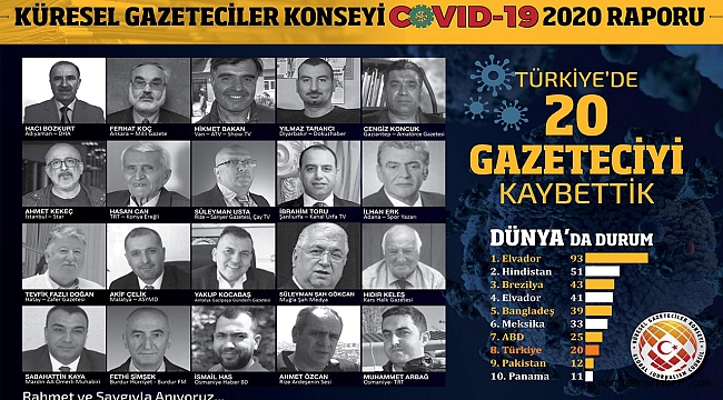 Küresel Gazeteciler Konseyi (KGK) tarafından yapılan yazılı açıklamada, Türkiye’de 2020 yılında koronavirüsenfeksiyonuna yakalanan 300’den fazla gazeteciden 20’sinin yaşamını yitirdiği belirtildi. Dünyada ise kesin rakamlar tam bilinmemekle birlikte uluslararası kuruluşların derlediği bilgiler ışığında, 20 binden fazla gazetecinin koronavirüse yakalandığı, bunlardan 600’ünün hayatını kaybettiği tahmin ediliyor. 93 gazetecinin virüsten can verdiği Peru’nun ilk sırayı aldığı listede, Türkiye 20 gazetecinin vefatı ile dünyada 8’inci sırada yer alıyor.