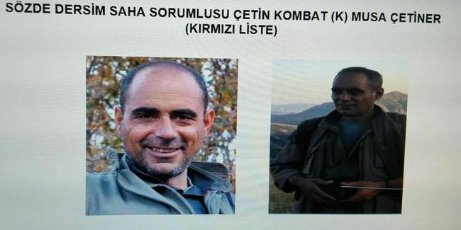 İçişleri Bakanlığı, 4 milyon TL ödüllü terörden arananlar listesinde kırmızı kategoride yer alan sözde Dersim saha sorumlusu Çetin kombat kod adlı Musa Çetiner'in etkisiz hale getirildiğini açıkladı.Bakanlıktan yapılan açıklamada, 30 Temmuz tarihinde Tunceli İl Jandarma Komutanlığınca Pülümür ilçesi Akdik köyü Söğütlü Mahallesi'nde icra edilen operasyonda etkisiz hale getirilen teröristin yapılan DNA testi sonucu sözde Dersim saha sorumlusu Çetin Kombat kod adlı Musa Çetiner olduğunun tespit edildiği ve Çetiner’in ‘terörden arananlar listesinde’ kırmızı kategoride arandığı, silahlı terör örgütüne üye olma, adam öldürmek, devletin egemenliği altında bulunan topraklarda bir kısmını devlet idaresinden ayırmaya çalışma suçları olmak üzere toplam 10 suçtan arandığı belirtildi.Etkisiz hale getirilen terörist Çetiner’in Tunceli Nizamiye İlçe Emniyet Amirliği ve İlçe Jandarma Karakoluna yönelik 22 Ağustos 2016 tarihinde eş zamanlı gerçekleşen ve 1 askerin şehit olduğu eylemi planladığı, 15 Temmuz 2016 tarihinde Nazimiye Kılköy Jandarma Karakol Komutanlığına bombalı araçla yapılan ve 1 askeri personelin hafif şekilde yaralandığı olayı planlayan ve yöneten olduğu, 2004 yılı Mayıs ayında Tendürek Dağı Esnemez köyü bölgesinde güvenlik güçleriyle silahlı çatışmaya girdiği, 16 Temmuz 2006 tarihinde Kars-Erzurum ara hattındaki tren yolunun mayınlanması olayını gerçekleştirdiği, 2005 yılında Çetinli köy yoluna mayın döşenerek 2 askerin şehit edilmesi, 3 Eylül 2011 tarihinde Iğdır Emniyet Müdürlüğüne saldırının talimatını verdiği, 13 Ekim 2011 tarihinde Iğdır ili Pamuk Geçidi'nde askeri konvoya saldırının talimatını verdiği, 26 Ekim 2011 tarihinde Doğubayazıt-lğdır yolunun kesilerek tır yakma, 26 Ekim 2011 tarihinde Iğdır ilinde iş makinelerinin yakılmasının talimatını verdiği, 11 Kasım 2011 günü Doğubayazıt-Çaldıran yolunda şantiye ve araçların yakılması olayının talimatını verdiği, 29 Nisan 2012 tarihinde Ağrı Doğubayazıt Aşağı Güngören Köyü bölgesinde yola EYP konulmasının talimatını verdiği, 30 Nisan 2012 tarihinde Doğubayazıt Karakol Tepe bölgesindeki pusu kuvveti ile silahlı çatışma, 28 Mayıs 2012 tarihinde, Iğdır-Korhan yolunun kesilmesi, 24 Mayıs 2012 tarihinde Iğdır Korhan Jandarma Karakolu yolunun kesilmesi, 31 Mayıs 2012 tarihinde Doğubayazıt asayiş sınır birliğine taciz, 6 Haziran 2012 tarihinde Ağrı İl Özel İdaresine ait greyderin yakılarak bir vatandaşın kaçırılmasının talimatını verdiği, 7 Haziran 2012 tarihinde Doğubayazıt boru hattına EYP'li saldırı, 8 Haziran 2012 tarihinde Diyadin İlçe Jandarma Komutanlığı nöbet kulübesine taciz ve 1 güvenlik korucusunun yaralanması, 18 Haziran 2012 tarihinde Iğdır-Aralık yolunun kesilmesi, 18 Haziran 2012 tarihinde Iğdır Serdarbulak Yaylası bölgesinde araç yakılması ve şoförün kaçırılması, 1 Temmuz 2012 tarihinde Doğubayazıt Çiftlikköy köyü baz istasyonuna sabotaj, 4 Ağustos 2012 tarihinde Doğubayazıt Somkaya köyü Vantaş Şirketine ait şantiye araçlarının yakılarak bir şahsın kaçırılarak, bir şahsın da yaralanmasının talimatını verdiği, 18 Eylül 2012 tarihinde Doğubayazıt Karakent köyü Soner İnşaatında bulunan vatandaşların kaçırılması ve 1 vatandaşın öldürülmesi eylemlerinin faili olduğu belirlendi.
