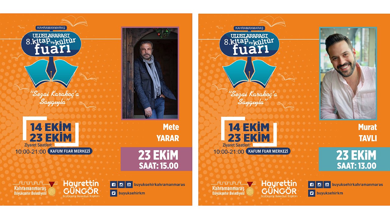 Uluslararası 8. Kitap ve Kültür Fuarı’nın son gününde usta yazarlar Mustafa Alyaz, Yasemin Karahüseyin, Fatih Akbaba ve Tufan Gündüz ile oyuncu Murat Tavlı, Kahramanmaraşlılarla bir araya gelecek.