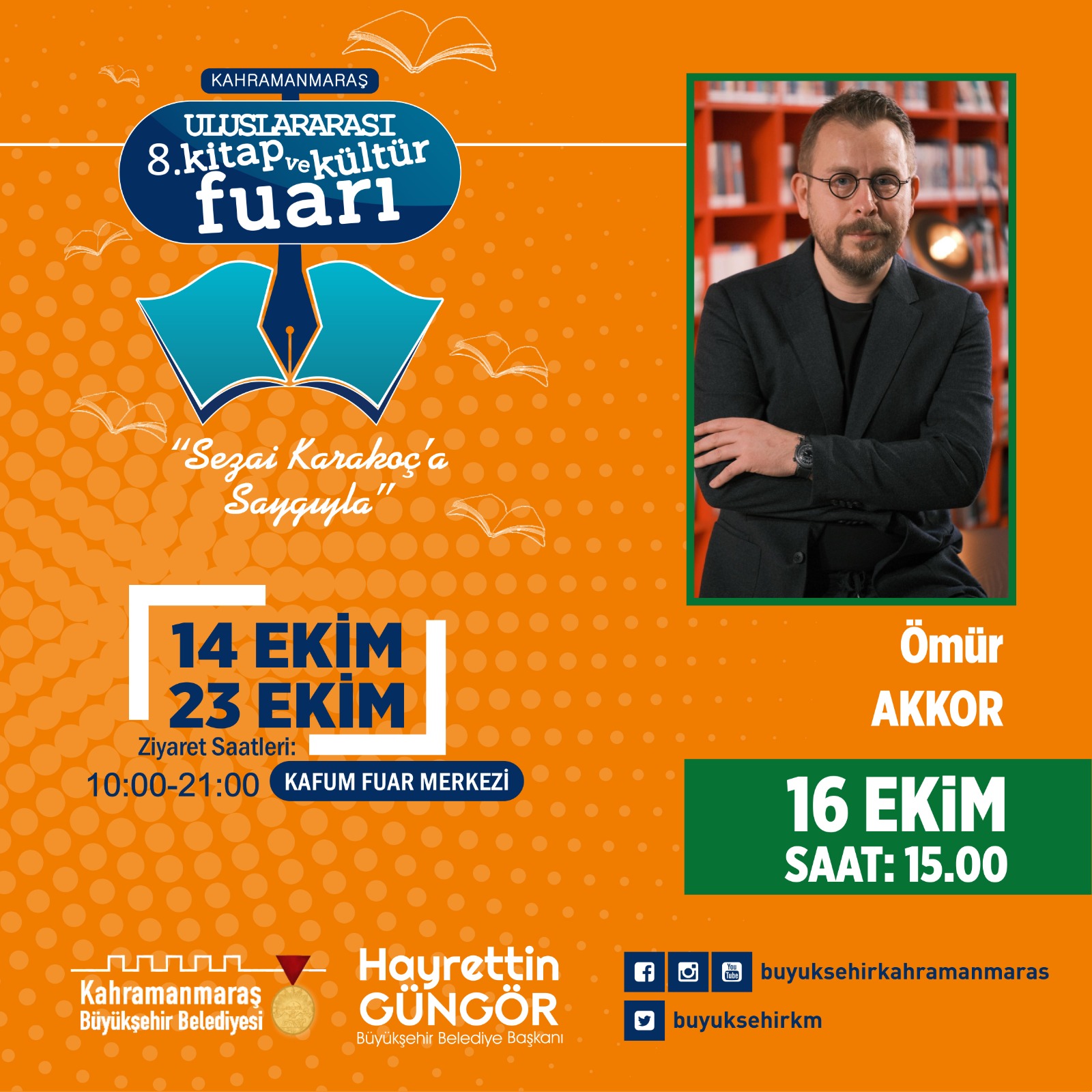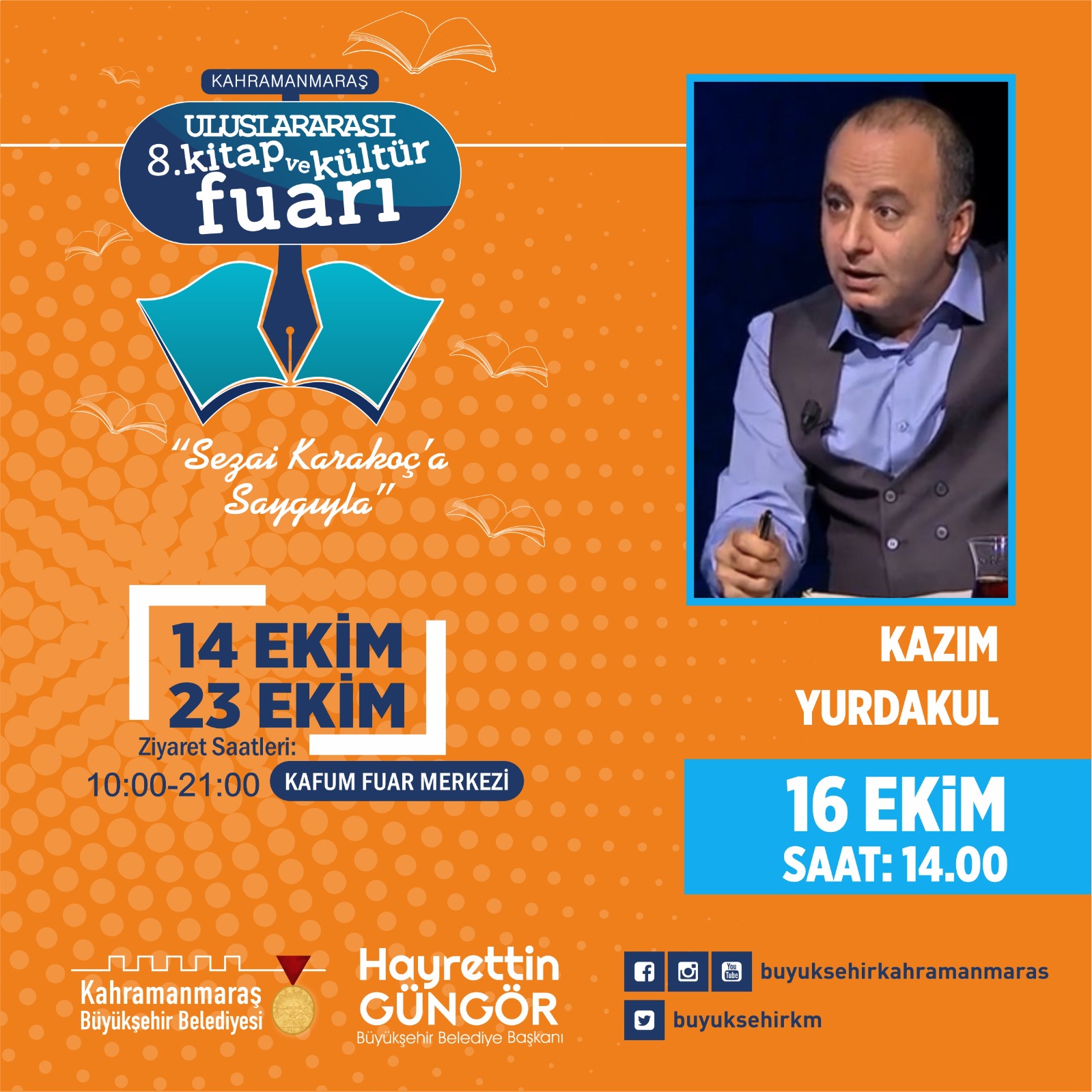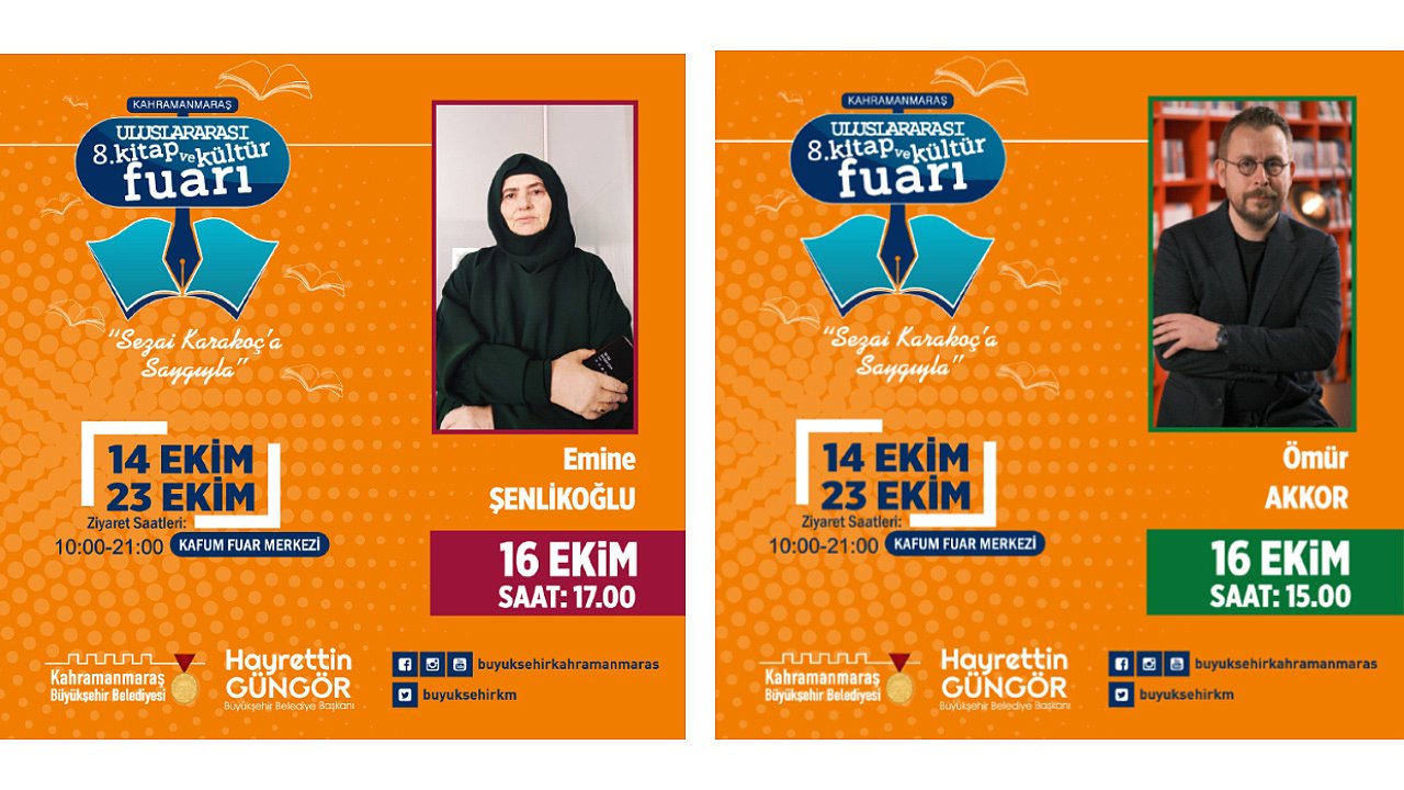 Kahramanmaraş Büyükşehir Belediyesi tarafından düzenlenen 8. Uluslararası Kitap ve Kültür Fuarı, üçüncü gününde de usta yazarların katılımıyla gerçekleştirilecek söyleşi, panel ve imza günü etkinlikleriyle devam edecek. 16 Ekim Pazar günü Kahramanmaraş Fuar Merkezi’nde (KAFUM) saat 11.00’da Gazeteci – Yazar Mustafa Alyaz, saat 13.00’da Psikiyatrist – Yazar Mustafa Ulusoy, saat 14.00’da Yazar Kazım Yurdakul, saat 15.00’da Ömür Akkor ve saat 17.00’da da Araştırmacı – Yazar Emine Şenlikoğlusöyleşi ve imza günü etkinliklerinde kültür sanat dostlarıyla buluşacak. Büyükşehir Belediyesi’nden yapılan açıklamada, etkinliklere tüm vatandaşların davetli olduğu belirtildi.