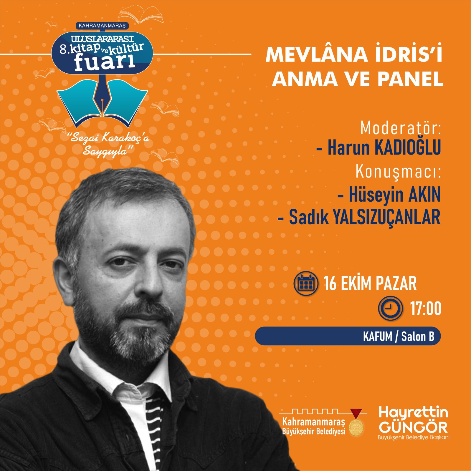 Kitap ve Kültür Fuarı’nın üçüncü gününde, ebediyete göç etmiş Kahramanmaraşlı usta yazarlar Rasim Özdenören ve Mevlâna İdris’i anma programı da gerçekleştirilecek. Saat 15.00’da Doç. Dr. Selim Somuncu moderatörlüğünde gerçekleştirilecek programda Süleyman Ceran ve Üzeyir İlbak, usta yazar Rasim Özdenören’i anlatacak. Saat 17.00’da gerçekleştirilecek panelde ise Mevlâna İdris’in hayatı ve Türk edebiyatına katkıları farklı açılardan ele alınacak.