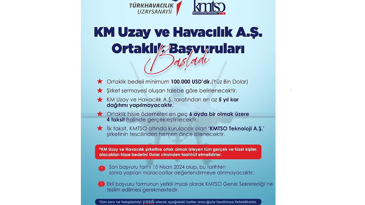 Şirket sermayesi, oluşacak talebe göre belirlenecek. KM Uzay ve Havacılık A.Ş. tarafından en az 5 yıl boyunca kar dağıtımı yapılmayacak. Ortaklık hisse ödemeleri ise en geç 6 ayda bir olmak üzere 4 taksit halinde gerçekleştirilecek. İlk taksit, KMTSO altında kurulacak olan "KMTSO Teknoloji A.Ş." şirketinin tescilinden hemen önce istenecek. GERÇEK VE TÜZEL KİŞİLER BAŞVURABİLİR