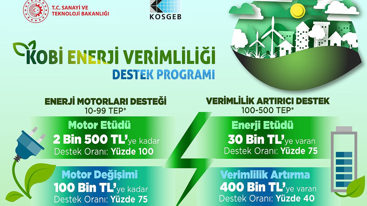 KOSGEB KOBİ’lerin yeşil dönüşüm konusunda mevcut durumlarının tespit edilerek sorun ve ihtiyaçlarının belirlenmesi, bu konuda gerekli stratejilerin oluşturulması, bu stratejiler doğrultusunda kapasitelerinin geliştirilmesi amacıyla KOBİ Enerji Verimliliği Destek Programı’nı açıklamıştır.
