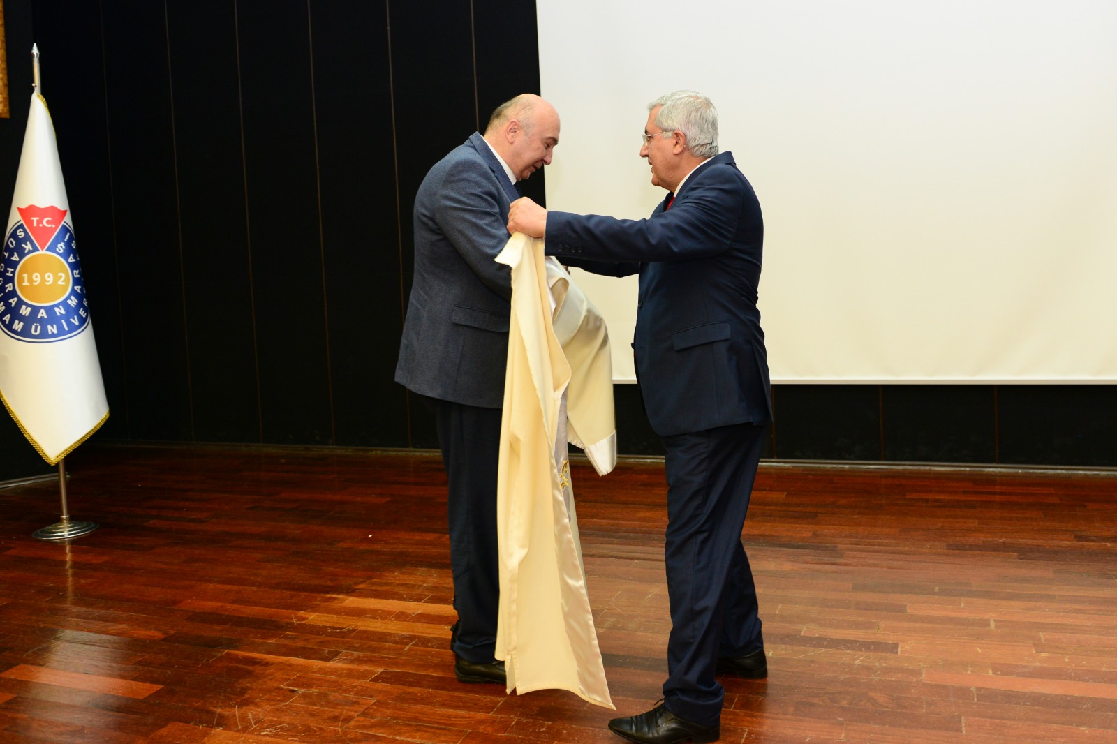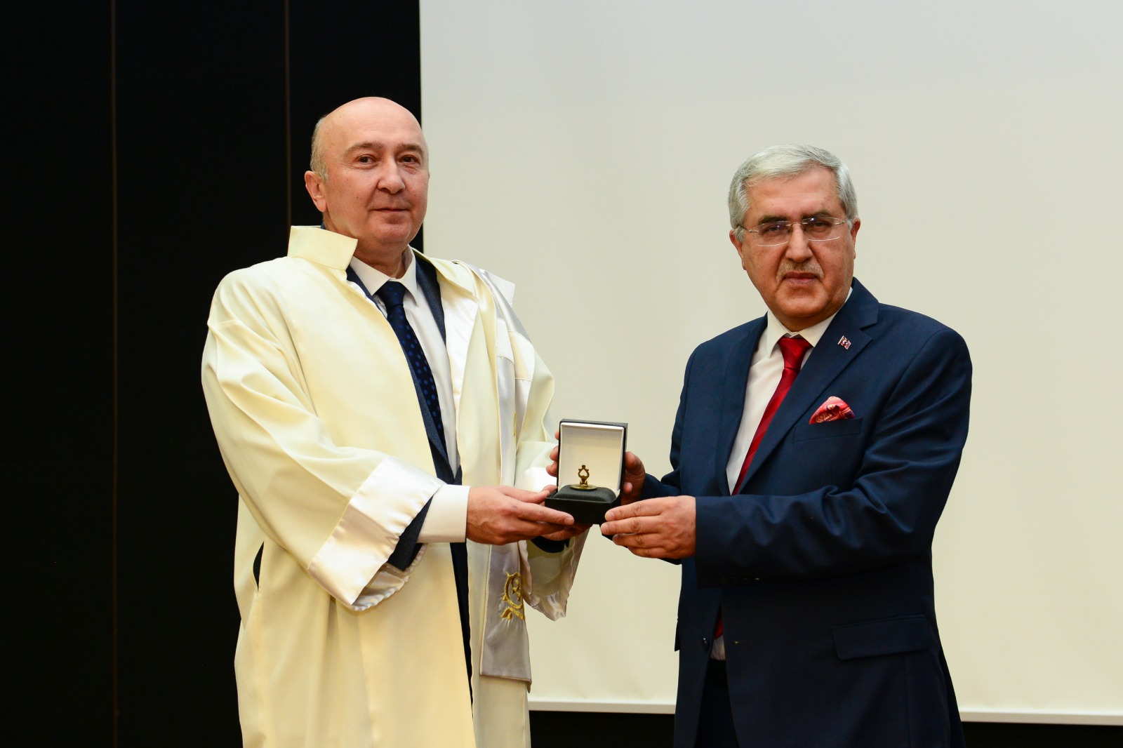 Ardından Prof. Dr. Niyazi Can, Prof. Dr. Alptekin Yasım’a Rektörlük Binişi giydirdi ve Rektörlük Mührünü teslim etti.