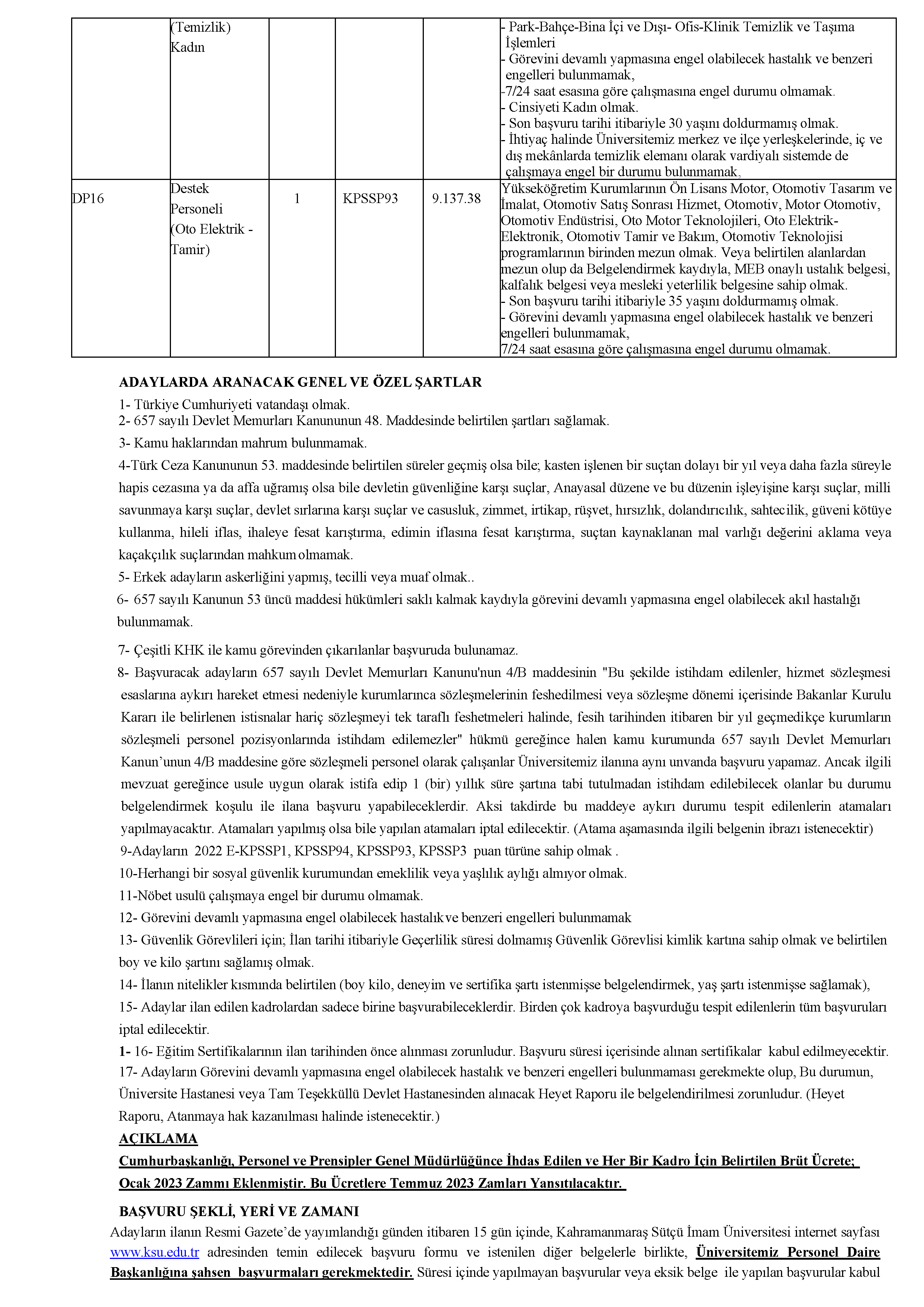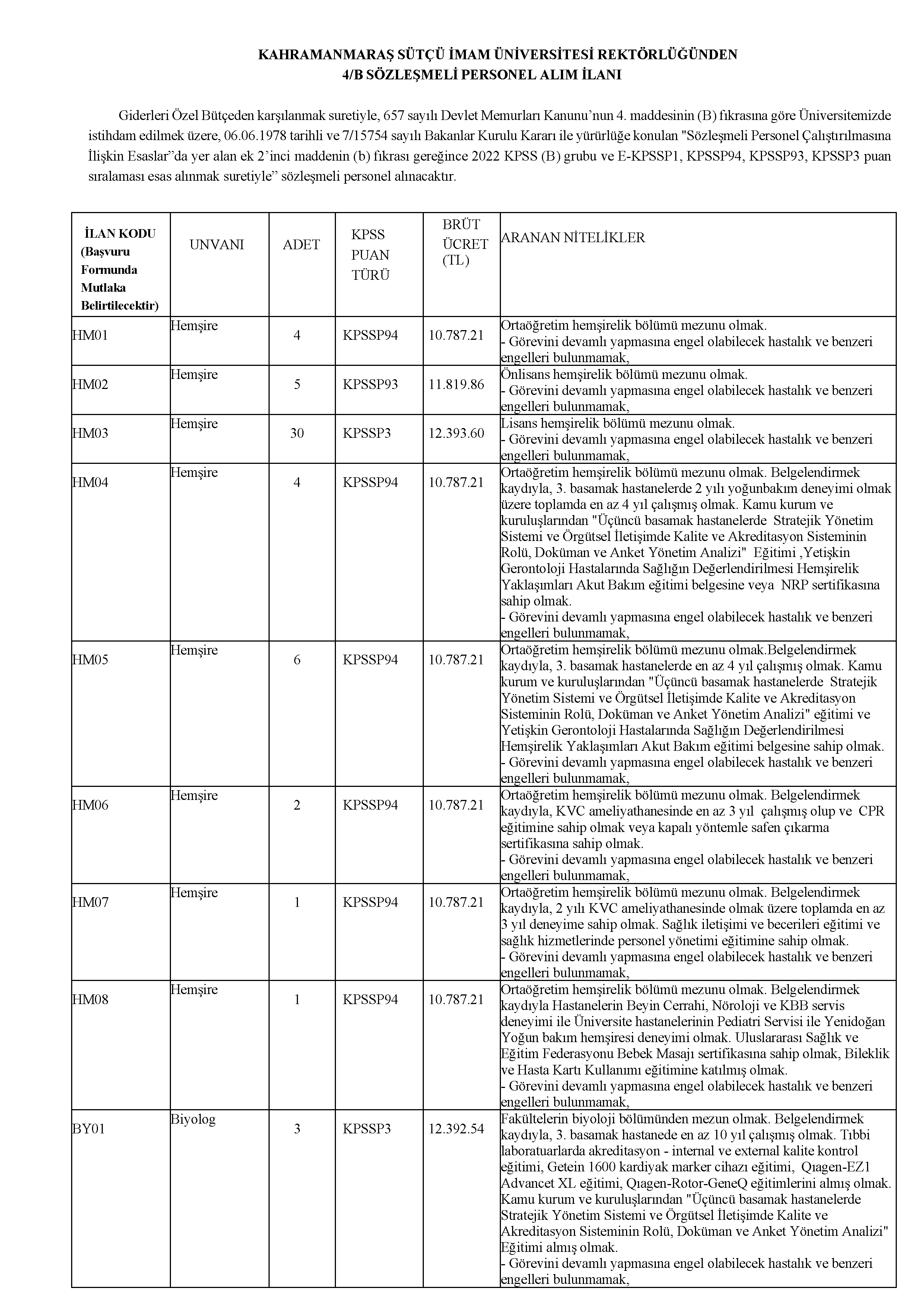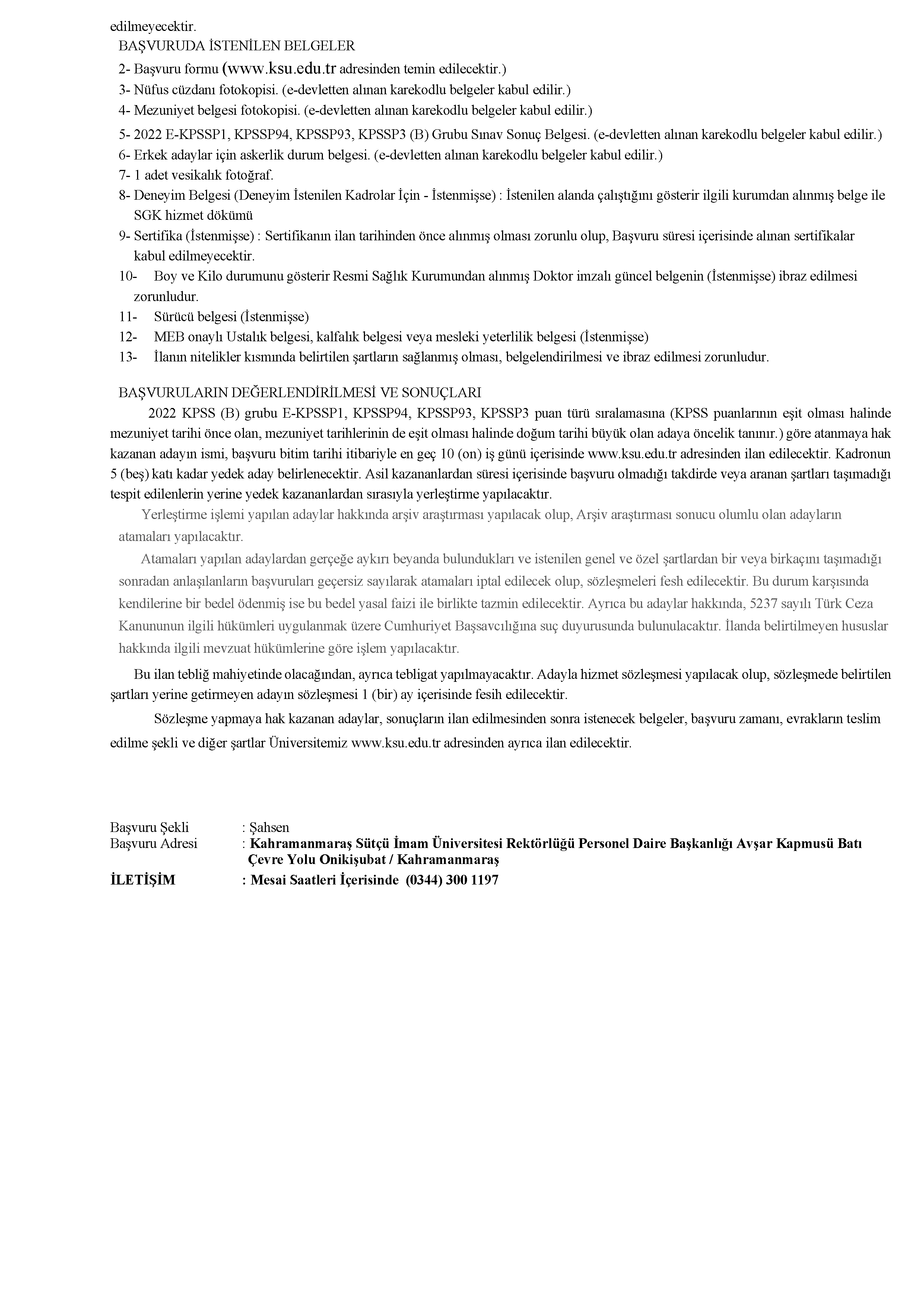 KSÜ, giderleri özel bütçeden karşılanmak suretiyle, 657 sayılı Devlet Memurları Kanunu’nun 4. maddesinin (B) fıkrasına göre üniversitede istihdam edilmek üzere, 06.06.1978 tarihli ve 7/15754 sayılı Bakanlar Kurulu Kararı ile yürürlüğe konulan "Sözleşmeli Personel Çalıştırılmasına İlişkin Esaslar”da yer alan ek 2’inci maddenin (b) fıkrası gereğince 2022 KPSS (B) grubu ve E-KPSSP1, KPSSP94, KPSSP93, KPSSP3 puan sıralaması esas alınmak suretiyle” sözleşmeli personel alımı için ilana çıktı.