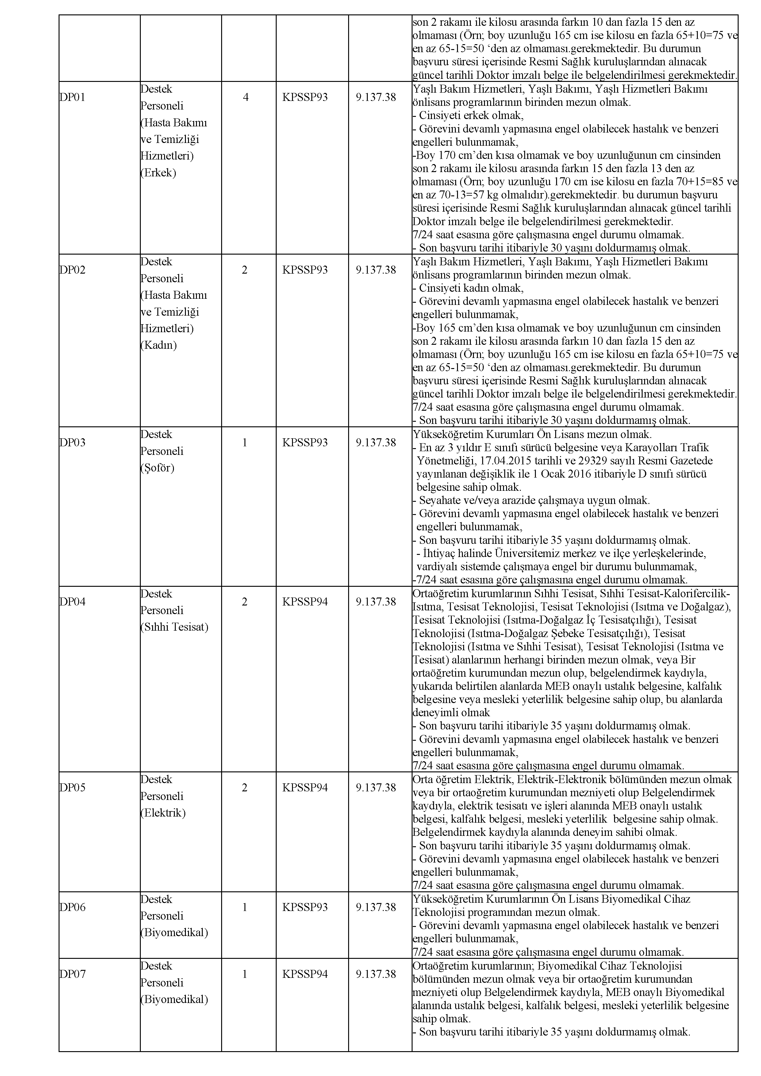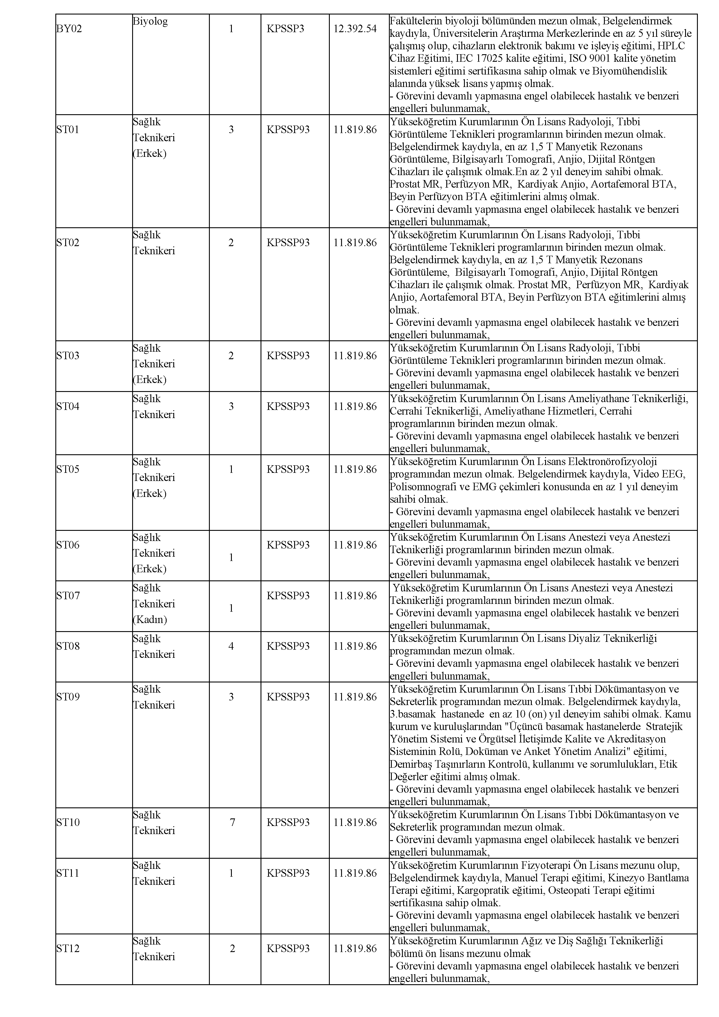 Biyolog Alımı: 3. basamak hastanede en az 10 yıl çalışmış olmak. Tıbbi laboratuarlarda akreditasyon - internal ve external kalite kontrol eğitimi, Getein 1600 kardiyak marker cihazı eğitimi, Qıagen-EZ1 Advancet XL eğitimi, Qıagen-Rotor-GeneQ eğitimlerini almış olmak. Kamu kurum ve kuruluşlarından "Üçüncü basamak hastanelerde Stratejik Yönetim Sistemi ve Örgütsel İletişimde Kalite ve Akreditasyon Sisteminin Rolü, Doküman ve Anket Yönetim Analizi" Eğitimi almış olmak.