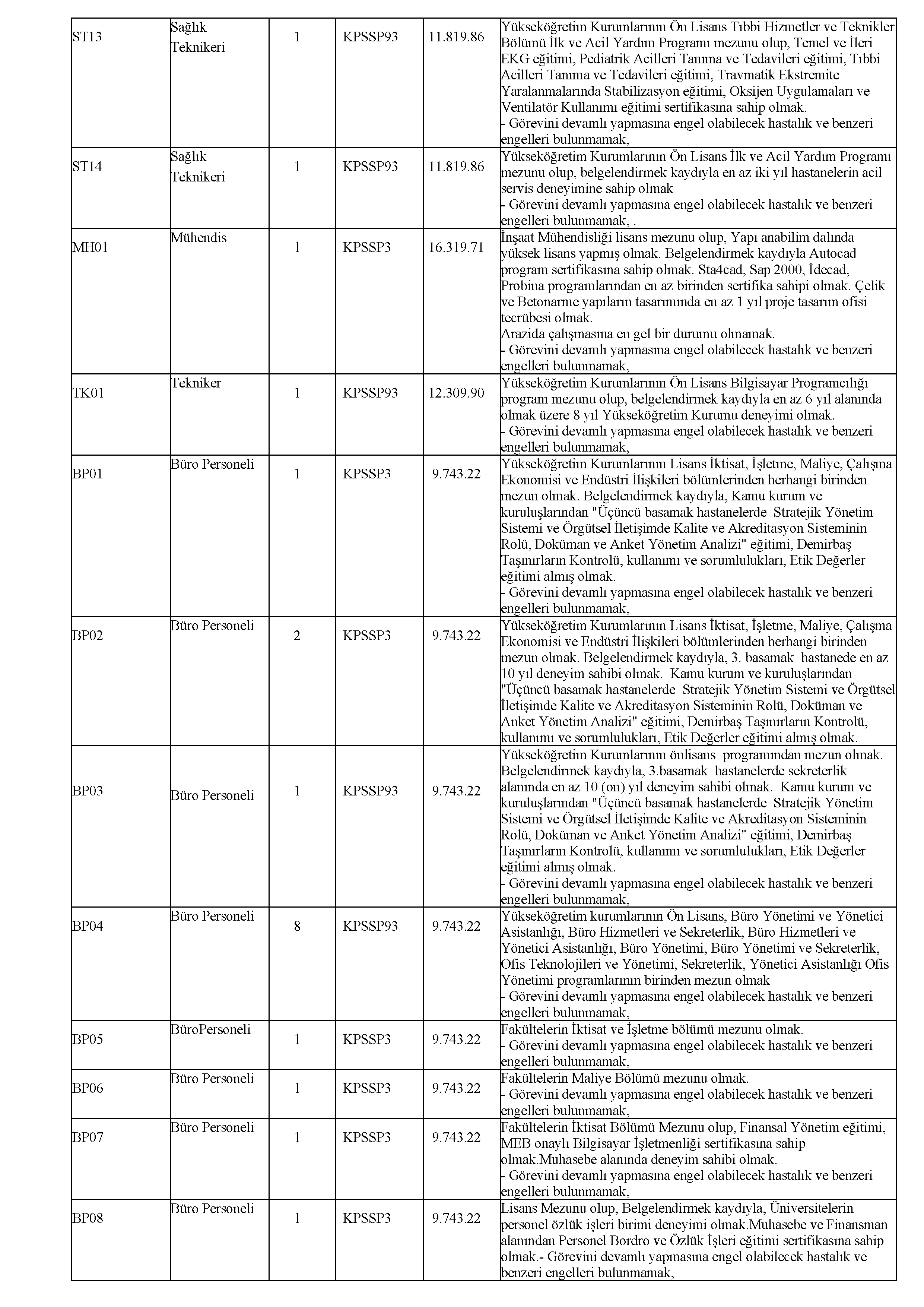 Sağlık Teknikeri Alımı: 3.basamak hastanede en az 10 (on) yıl deneyim sahibi olmak. Kamu kurum ve kuruluşlarından "Üçüncü basamak hastanelerde Stratejik Yönetim Sistemi ve Örgütsel İletişimde Kalite ve Akreditasyon Sisteminin Rolü, Doküman ve Anket Yönetim Analizi" eğitimi, Demirbaş Taşınırların Kontrolü, kullanımı ve sorumlulukları, Etik Değerler eğitimi almış olmak.
