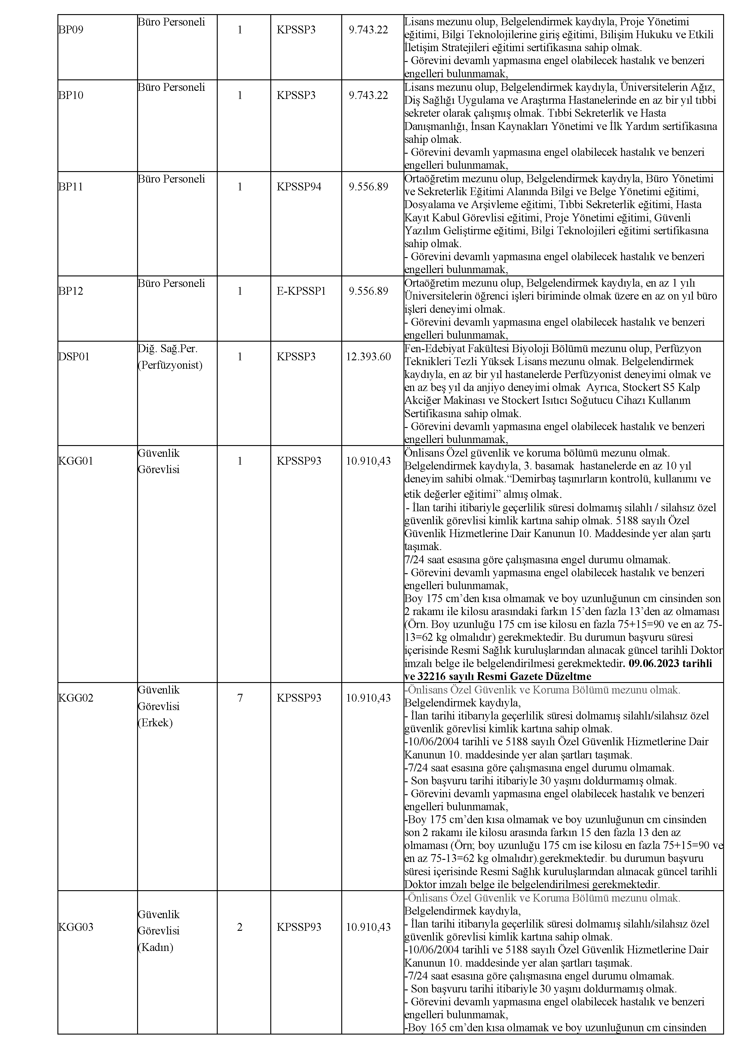 Güvenlik Görevlisi Alımı: Belgelendirmek kaydıyla, 3. basamak hastanelerde en az 10 yıl deneyim sahibi olmak.“Demirbaş taşınırların kontrolü, kullanımı ve etik değerler eğitimi” almış olmak.