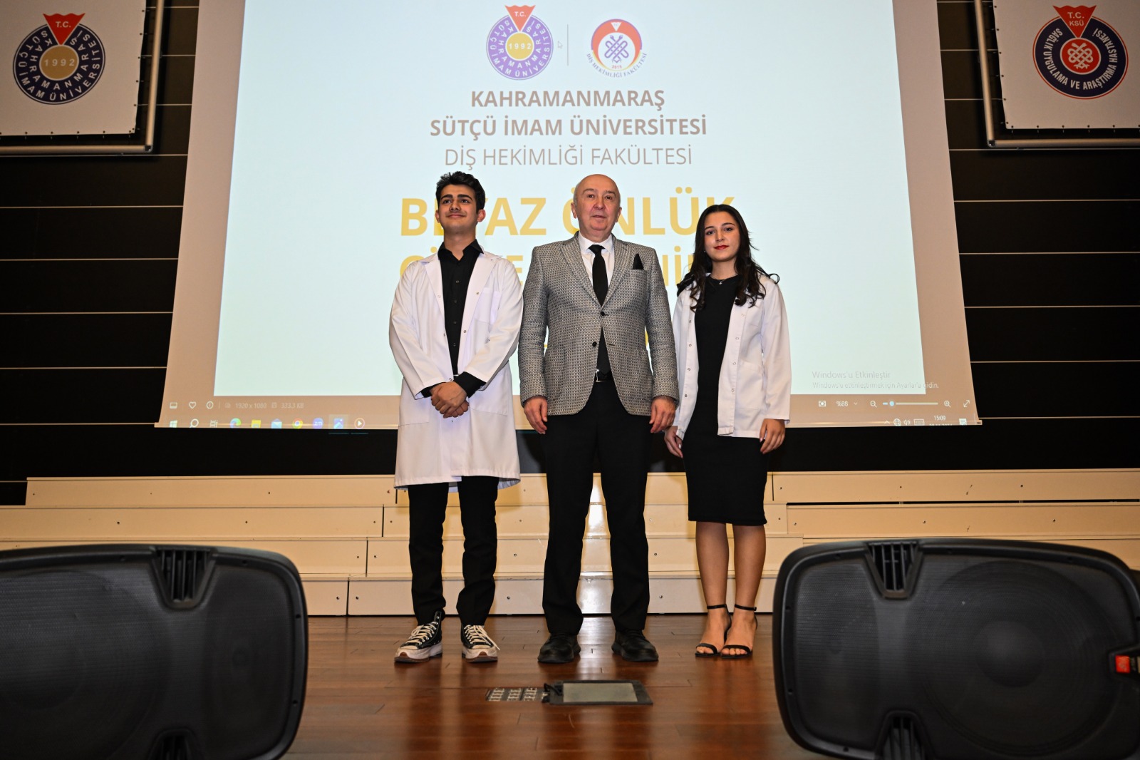 KSÜ Tıp Fakültesi Konferans Salonunda yapılan törene Rektör Prof. Dr. Alptekin Yasım, Rektör Yardımcıları Prof. Dr. İrfan Ersin Akıncı, Prof. Dr. Nuri Kahveci, Prof. Dr. Orhan Doğan, Prof. Dr. Hafize Öksüz, Diş Hekimliği Fakültesi Dekanı Prof. Dr. Kamile Gül, İktisadi ve İdari Bilimler Fakültesi Dekanı Prof. Dr. Ali Haluk Pınar, Spor Bilimleri Fakültesi Dekanı Prof. Dr. Ünal Türkçapar, Kahramanmaraş Diş Hekimleri Odası Başkan VekiliDt. İsmail Kuybu, akademisyenler, öğrenciler ve öğrenci velileri katıldı.Saygı duruşu ve İstiklal Marşı’nın okunmasıyla başlayan törenin açılış konuşmasını Rektör Prof. Dr. Alptekin Yasım yaptı.Rektör Yasım konuşmasında “Bu eğitime başladıktan sonra artık öğrenci psikolojisinden çıkmanız, hekimlik şuuruyla hareket etmeniz lazım. Derslerinize, geçer not almak için değil öğrenmek için çalışmalısınız. Sınıfı geçmek kaygısından ziyade mesleği öğrenme kaygısıyla derslerinize eğilin. Beyaz önlük giyerek bu kutsal mesleğe adım atmış olacaksınız. Buradan mezun olduktan sonra nerede çalışırsanız çalışın, başarılı olmakla birlikte vatanınızı ve milletinizi de çok severek hareket edin.” ifadelerini kullandı.Rektör Yasım konuşmasını, vermiş oldukları emeklerden dolayı ailelere ve fakülte hocalarına da teşekkür ederek tamamladı.